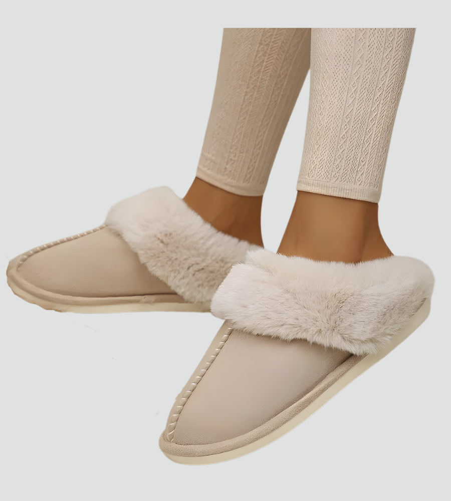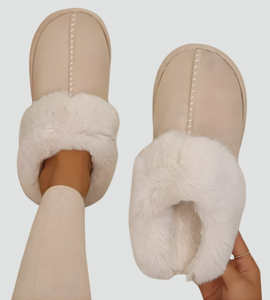 Beżowe puszyste zimowe kapcie damskie z antypoślizgową podeszwą