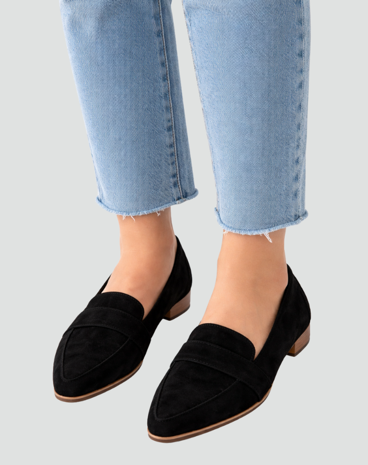 Te stylowe mokasyny zamszowe to idealne połączenie kobiecej elegancji i codziennej wygody. Smukły nosek w szpic pięknie wysmukla stopę, a miękka cholewka dopasowuje się do kształtu stopy bez ucisku. Dzięki płaskiej, elastycznej podeszwie buty są wygodne przez cały dzień – świetnie sprawdzą się zarówno do dżinsów, jak i do spodni materiałowych czy sukienek.