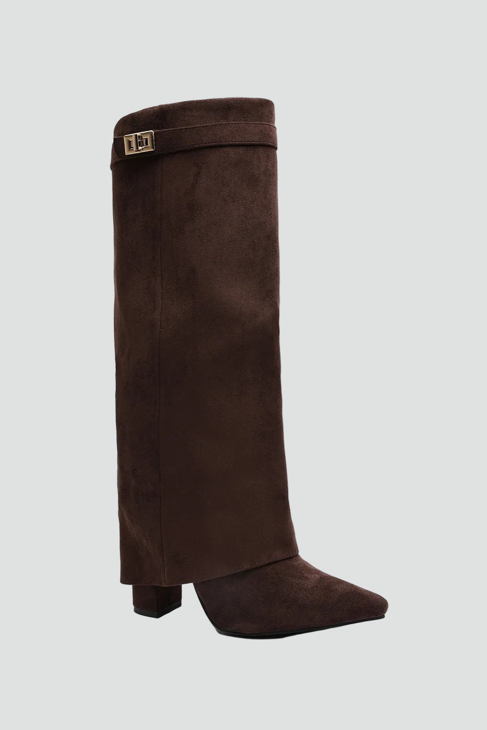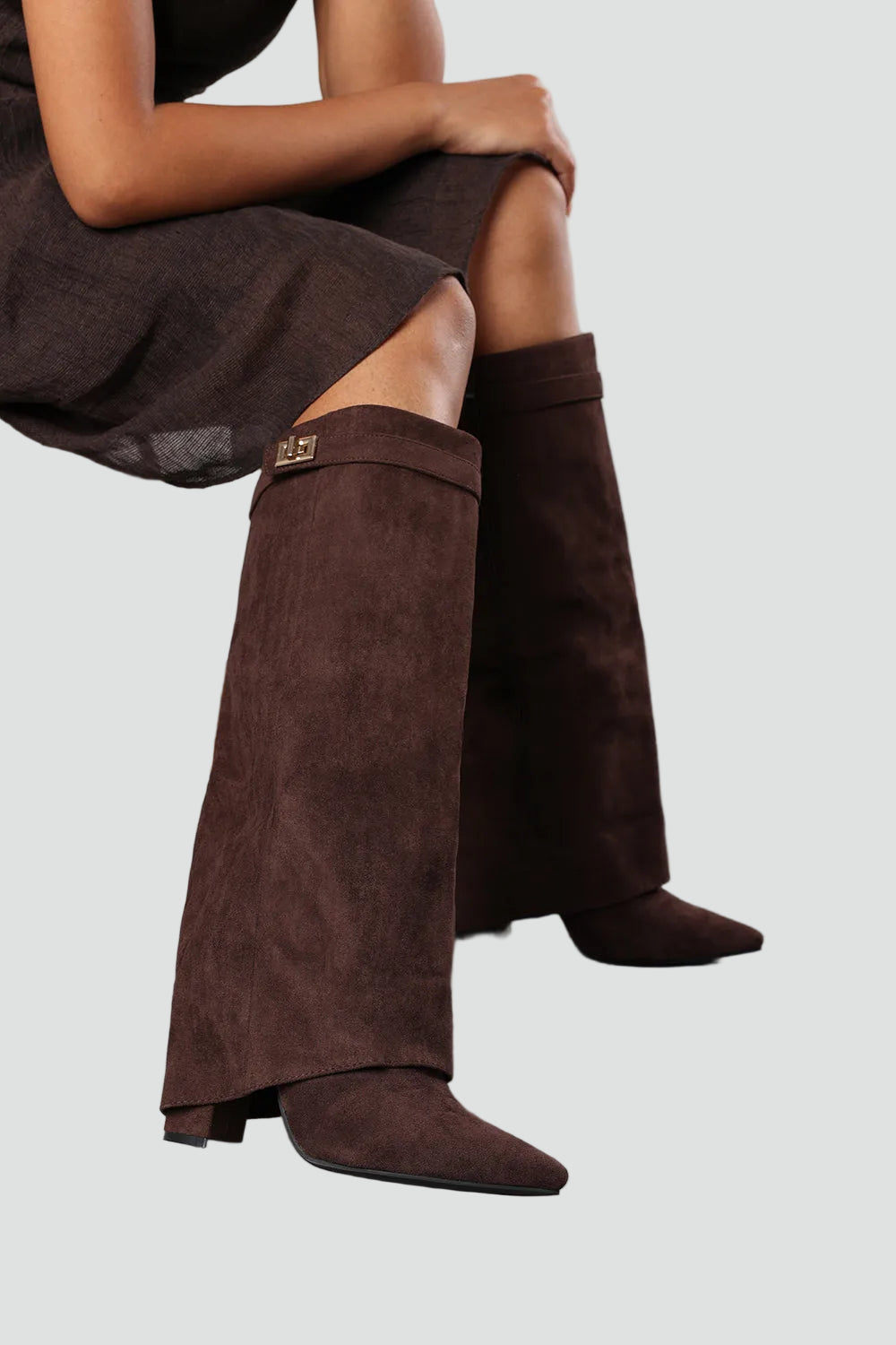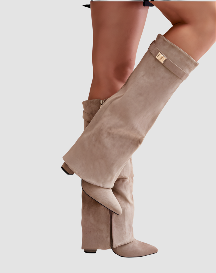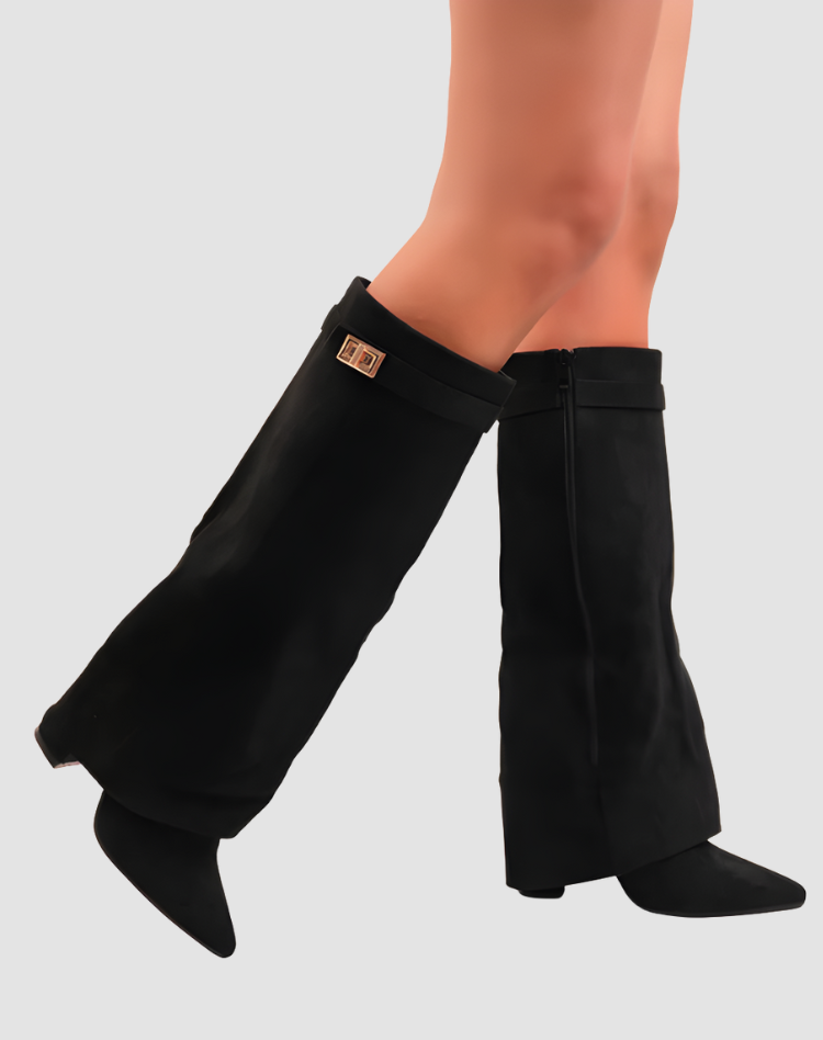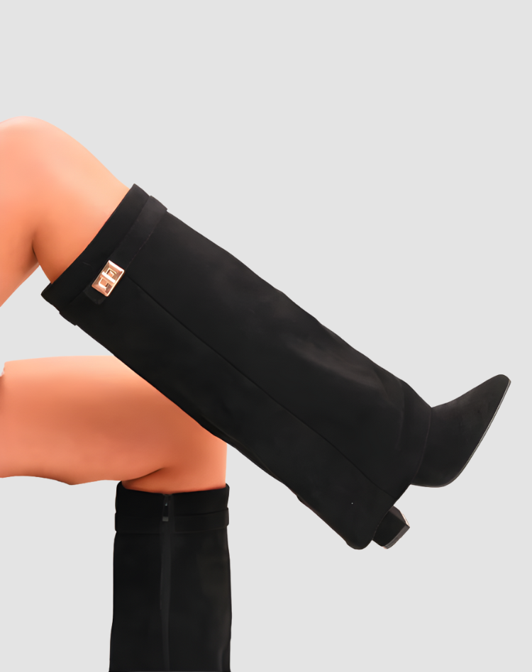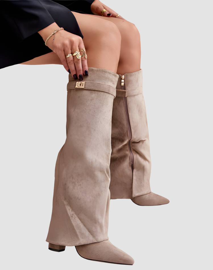 Te stylowe kozaki damskie do kolan zamszowy look z klamrą i szpiczastym noskiem to idealny model, gdy chcesz dodać swojej stylizacji elegancji z lekkim modowym twistem. Szeroka cholewka pięknie otula łydkę i tworzy efekt nowoczesnej, lekko oversize’owej formy, a stabilny obcas dodaje kilku centymetrów, nie odbierając komfortu. Świetnie wyglądają zarówno z dopasowaną sukienką, jak i z ulubionymi jeansami wpuszczonymi do środka.