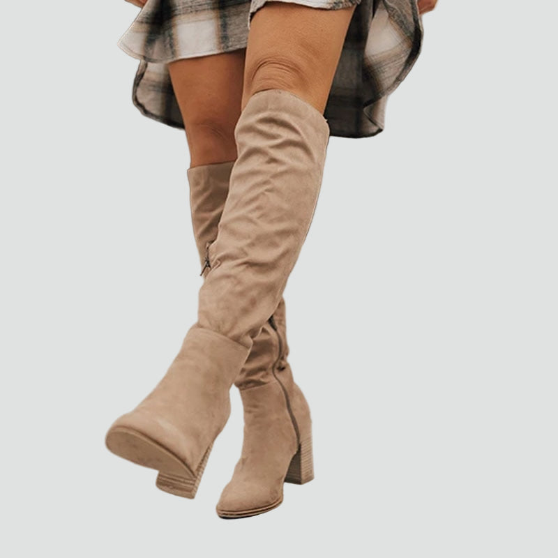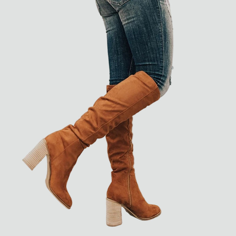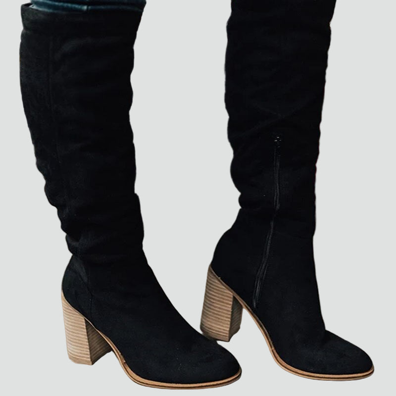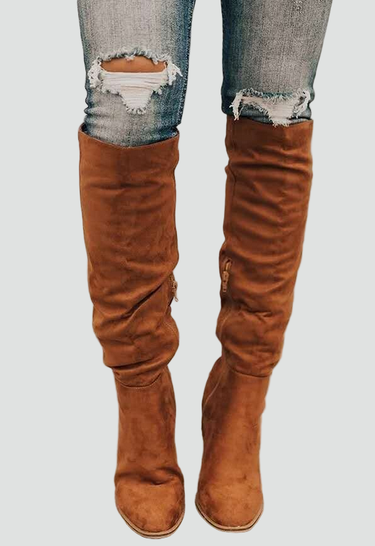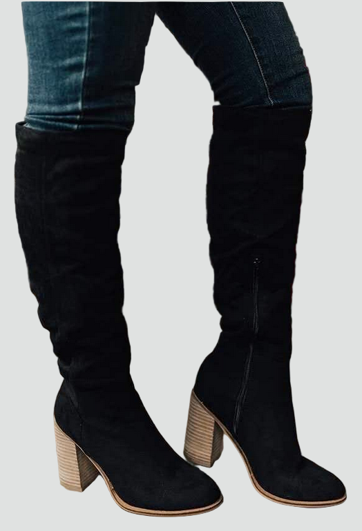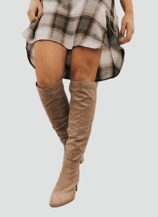Zamszowe kozaki damskie na słupku z wysoką cholewką