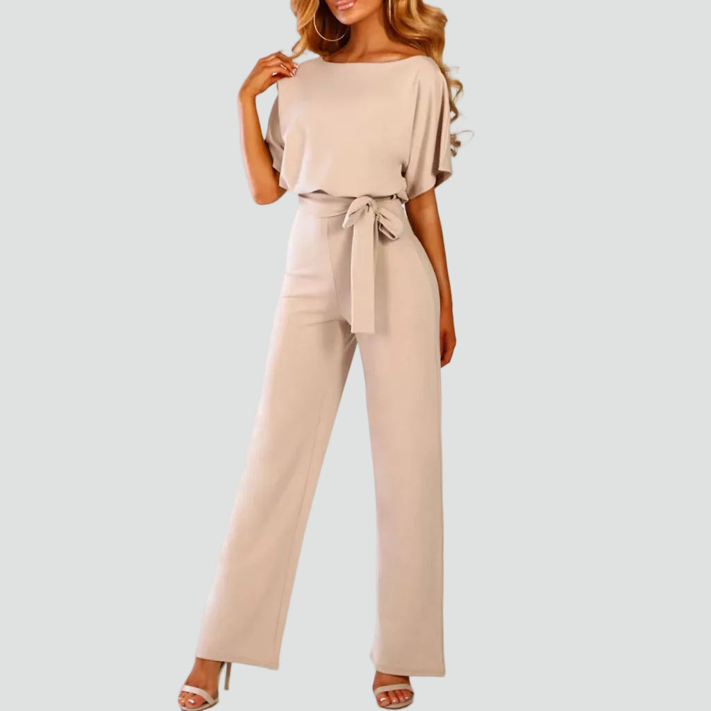 Damski elegancki kombinezon z krótkim rękawem i wiązaniem w talii