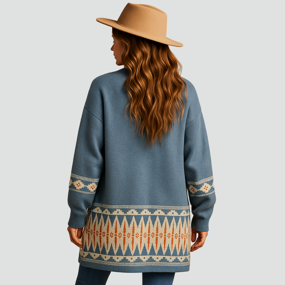 Długi boho kardigan dla kobiet z geometrycznym wzorem i luźnym krojem
