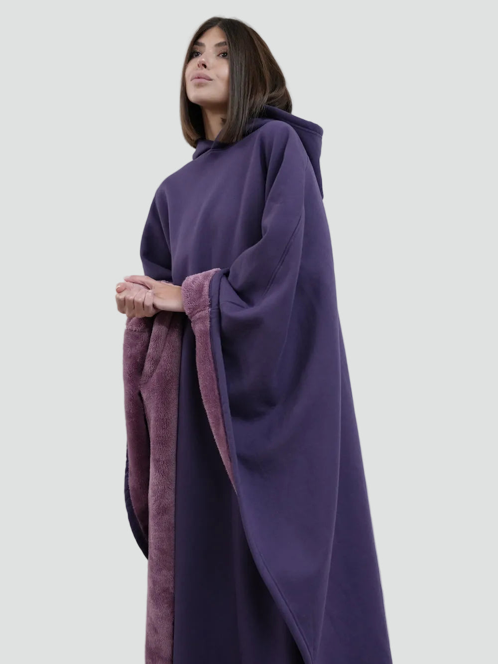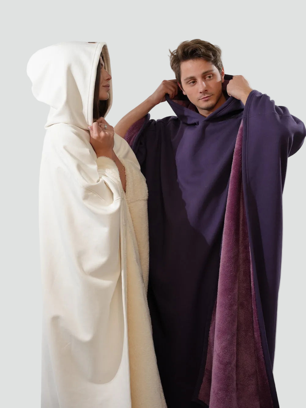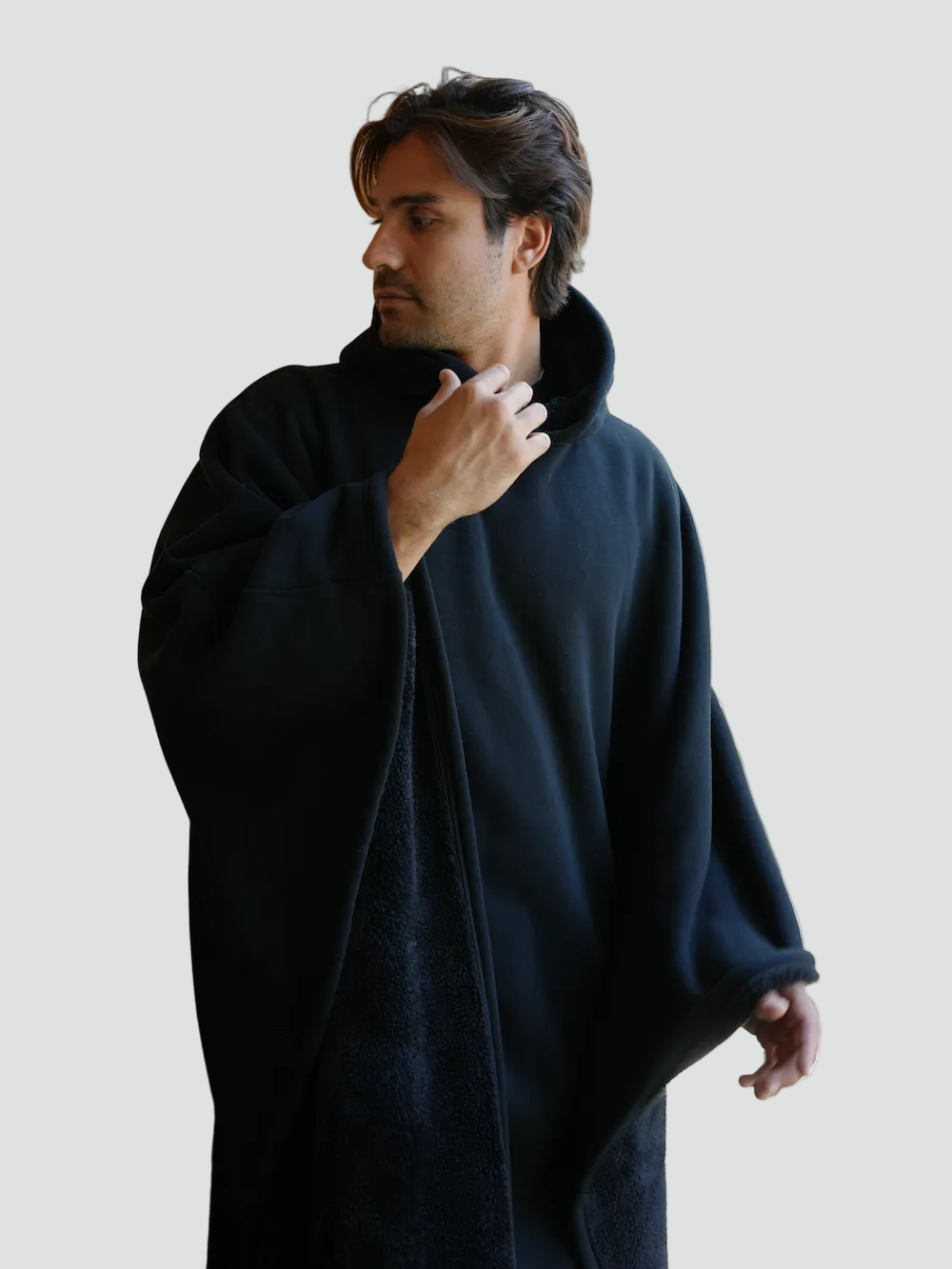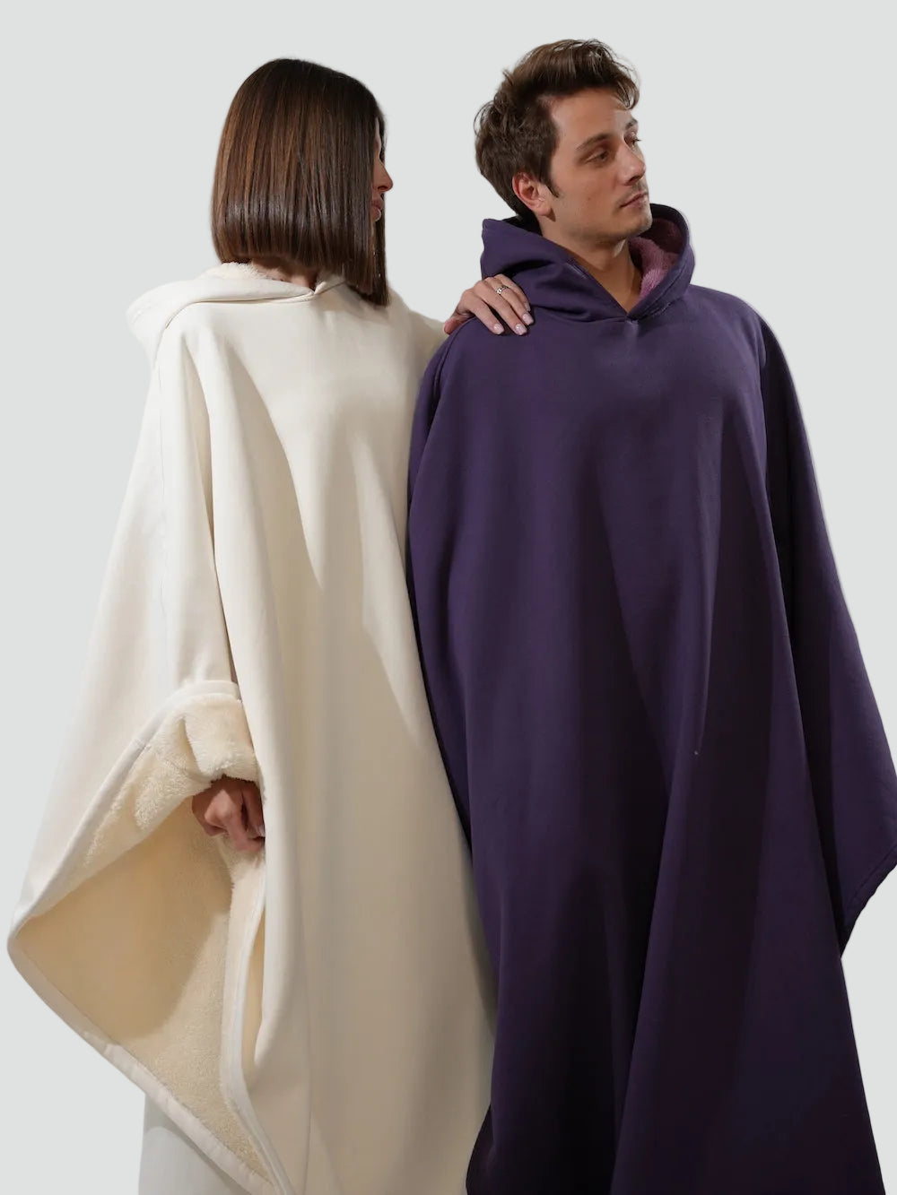 Ten ciepły koc ponczo z kapturem unisex to idealny towarzysz na chłodne wieczory, kiedy chcesz po prostu otulić się czymś miękkim i odpocząć. Z jednej strony gładki materiał, z drugiej supermiękki polar tworzą przytulny kokon, w którym możesz leżeć na kanapie, czytać książkę albo oglądać serial. Oversize’owy krój z wygodnym kapturem sprawia, że świetnie sprawdzi się zarówno w domu, jak i na tarasie, kempingu czy podczas zimowych wyjazdów.
