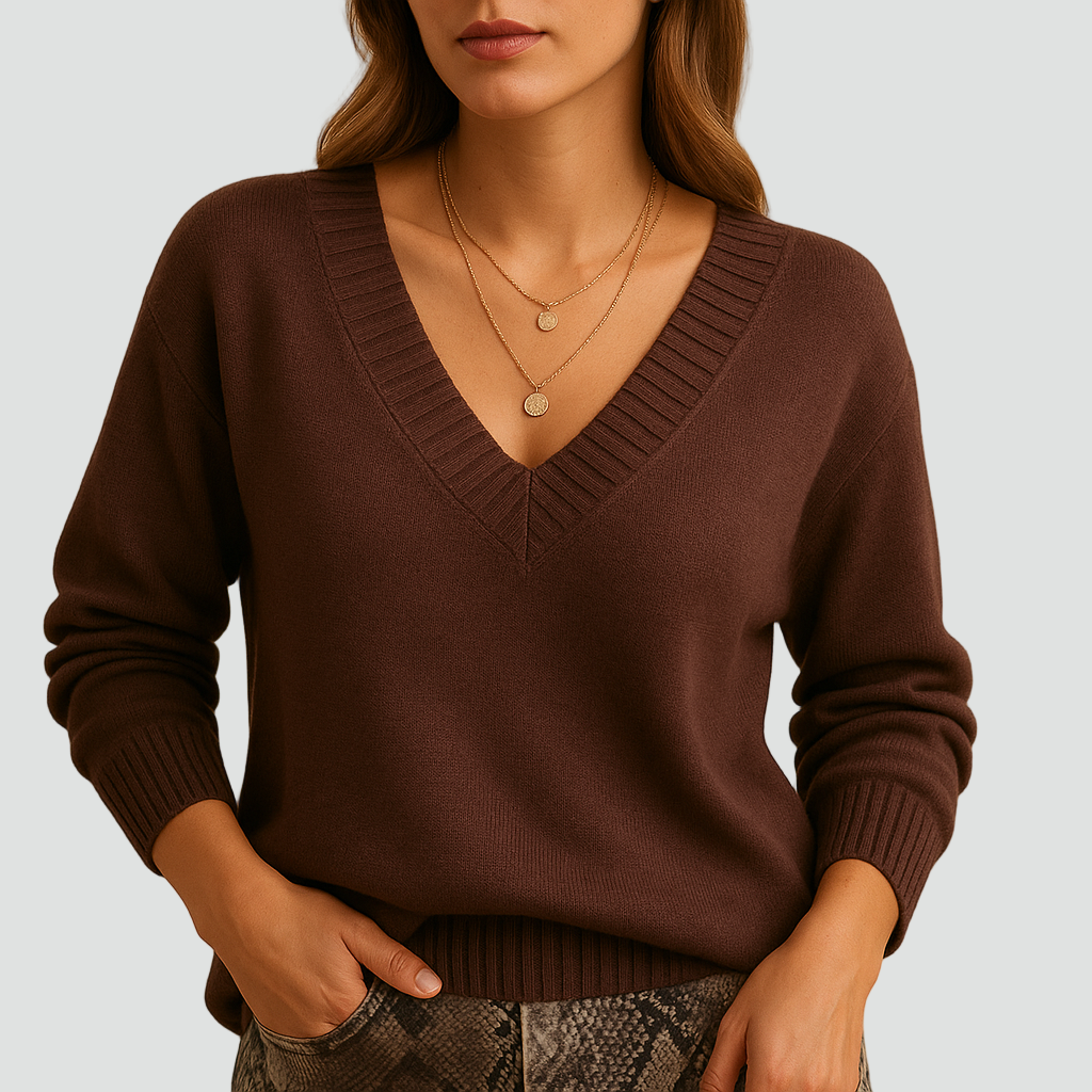 Klasyczny sweter dla kobiet z dekoltem w serek i prążkowanymi mankietami