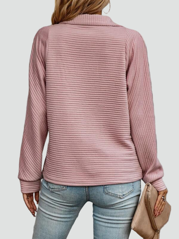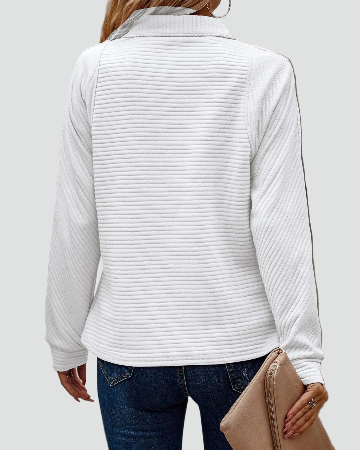 Ta prążkowana bluza z półgolfem na zamek to idealny wybór na dni, kiedy chcesz czuć się swobodnie, ale nadal wyglądać schludnie. Miękki materiał przyjemnie otula, a lekko luźny krój dobrze układa się do jeansów, legginsów czy joggerów. Zamek przy dekolcie pozwala nosić ją bardziej pod szyję w chłodniejsze dni albo lekko rozpiętą, w luźniejszej wersji na co dzień.