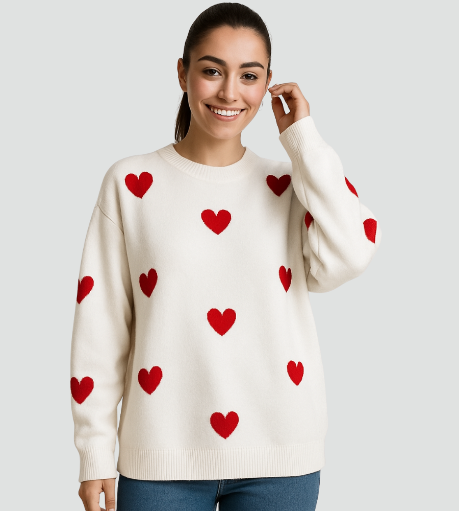 Jeśli lubisz ubrania, które od razu poprawiają nastrój, ten sweter z serduszkami szybko stanie się twoim ulubionym na co dzień.