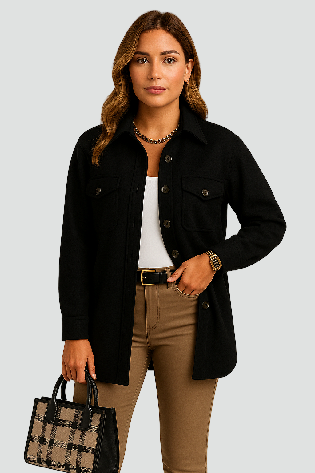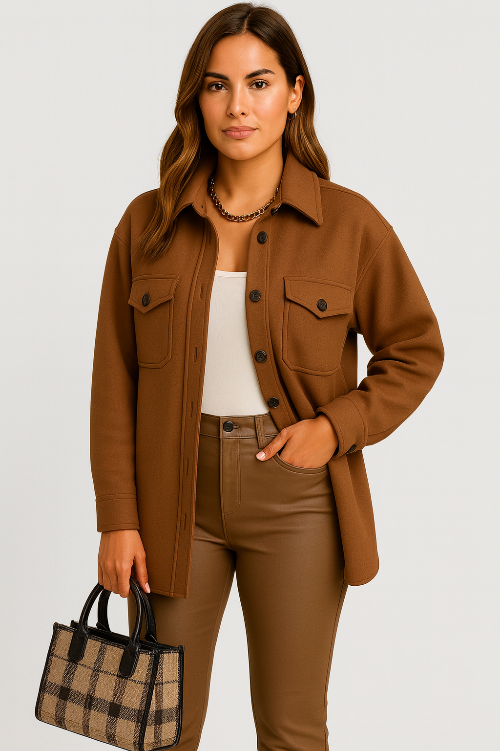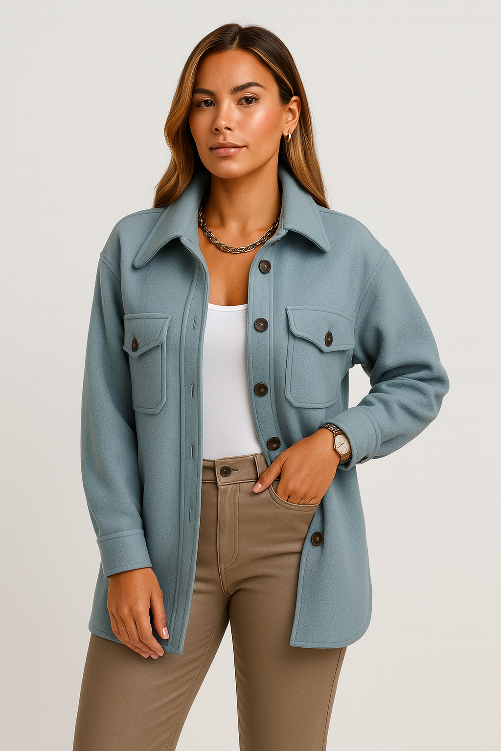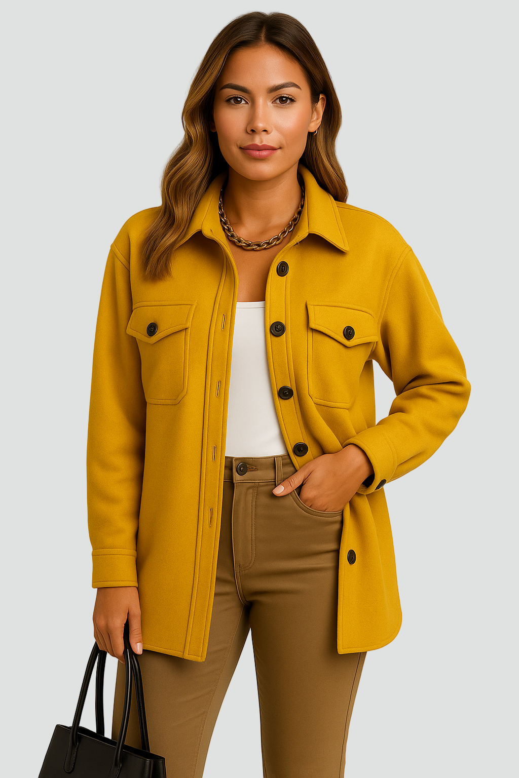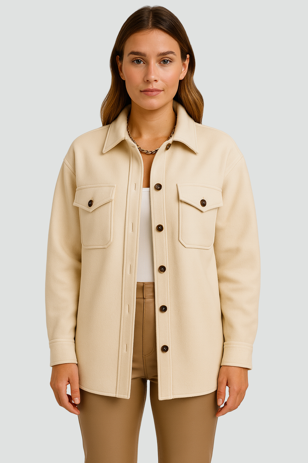 Stylowa koszulowa kurtka, która łączy luz z elegancją. Wykonana z miękkiego materiału o gładkiej strukturze, idealna na przejściowe pory roku. Klasyczny krój z kołnierzykiem i guzikami dodaje jej ponadczasowego charakteru, a praktyczne kieszenie z przodu zapewniają funkcjonalność. Doskonale sprawdzi się zarówno w casualowych, jak i biurowych stylizacjach.