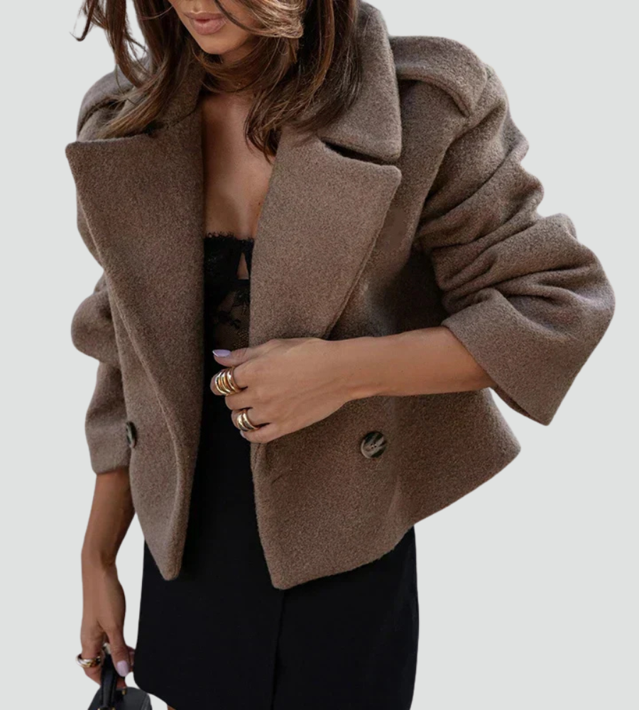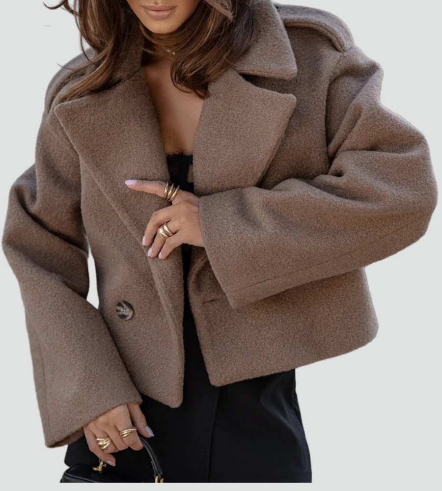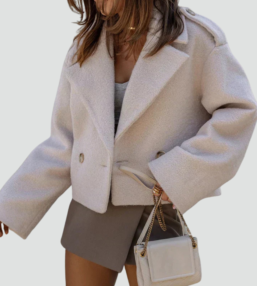 Ten krótki wełniany płaszcz to idealne okrycie na chłodniejsze dni, kiedy chcesz wyglądać elegancko, ale bez zbyt formalnego efektu. Miękka tkanina o wełnianym chwycie grzeje, a skrócony, lekko pudełkowy krój świetnie pasuje i do sukienek, i do spodni z wysokim stanem.
