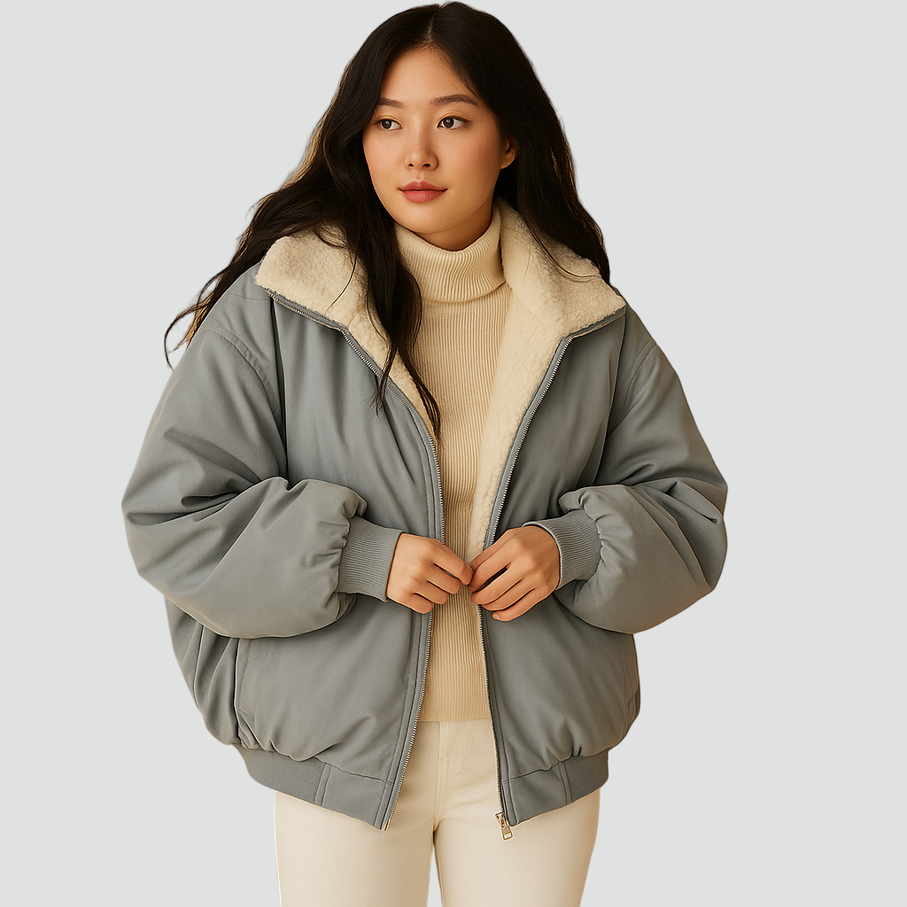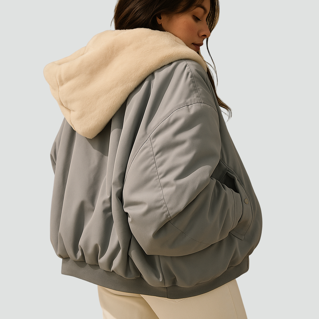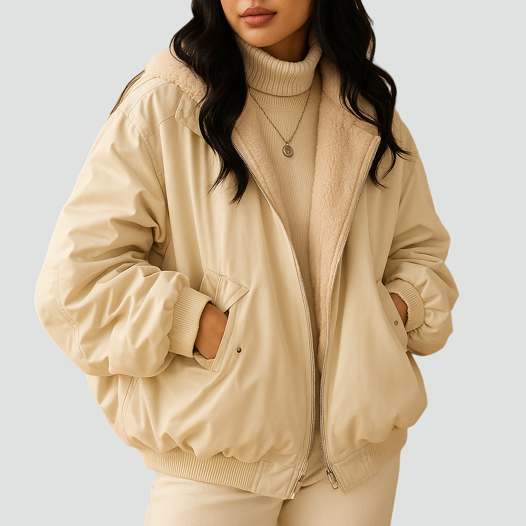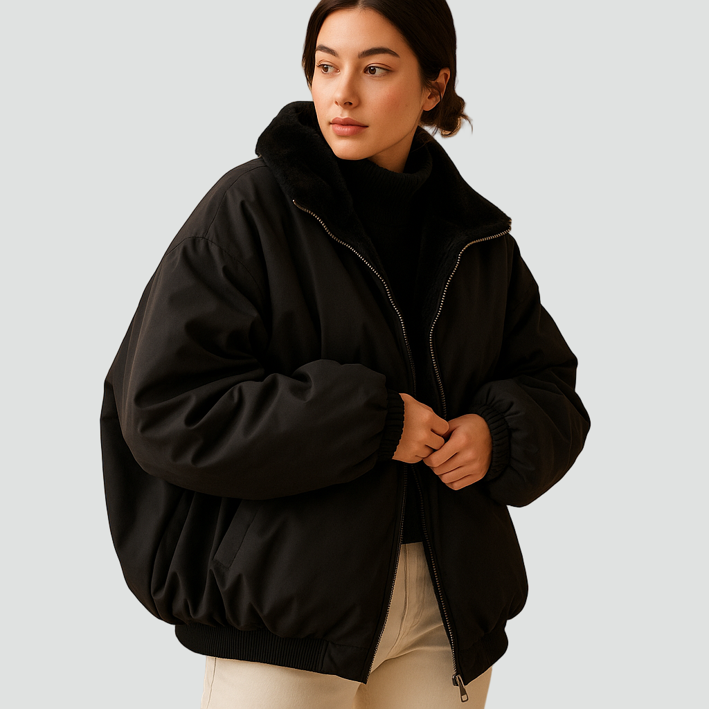 Stylowa kurtka bomber z miękkim kołnierzem ze sztucznego futerka to połączenie wygody i modnego designu. Lekko oversize’owy krój zapewnia swobodę ruchów, a przyjemne w dotyku ocieplenie gwarantuje komfort w chłodniejsze dni. Elastyczne ściągacze przy rękawach i dole nadają jej sportowego charakteru, zachowując jednocześnie kobiecy styl.