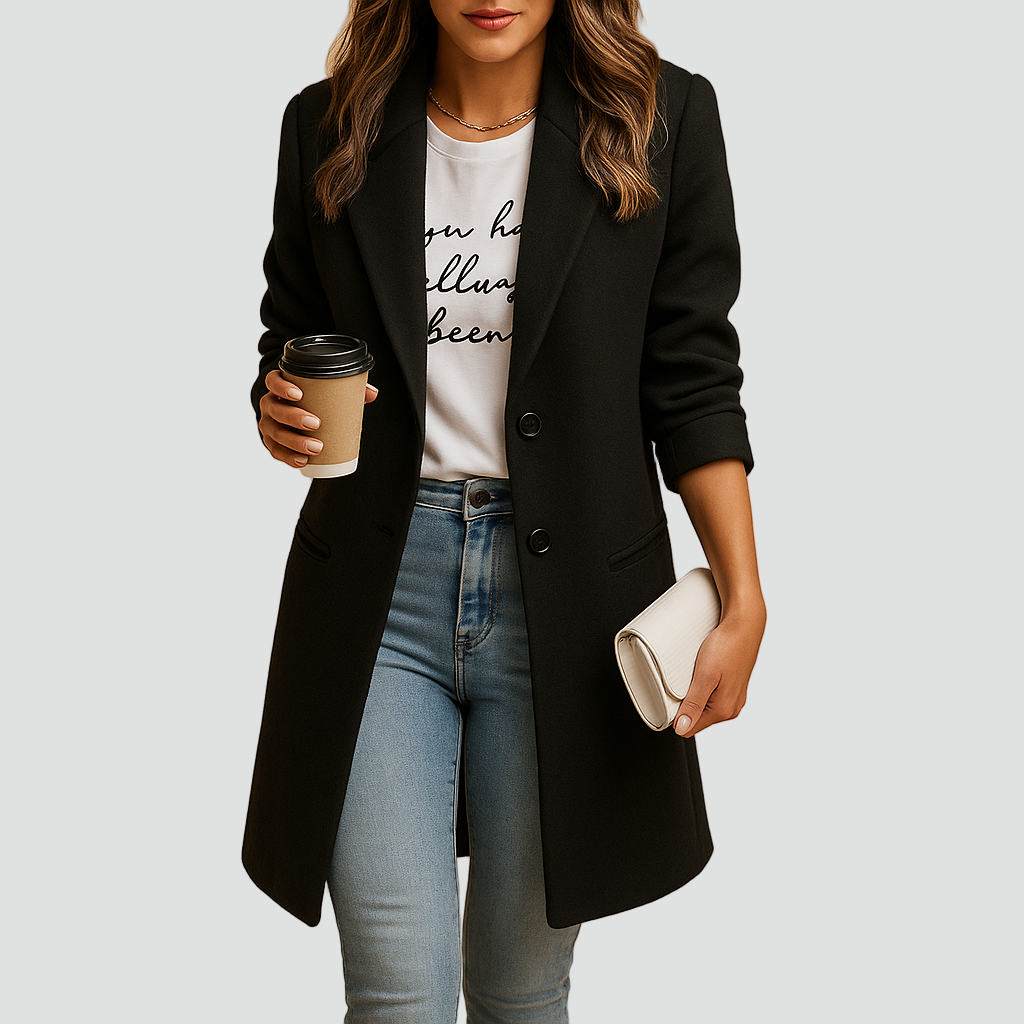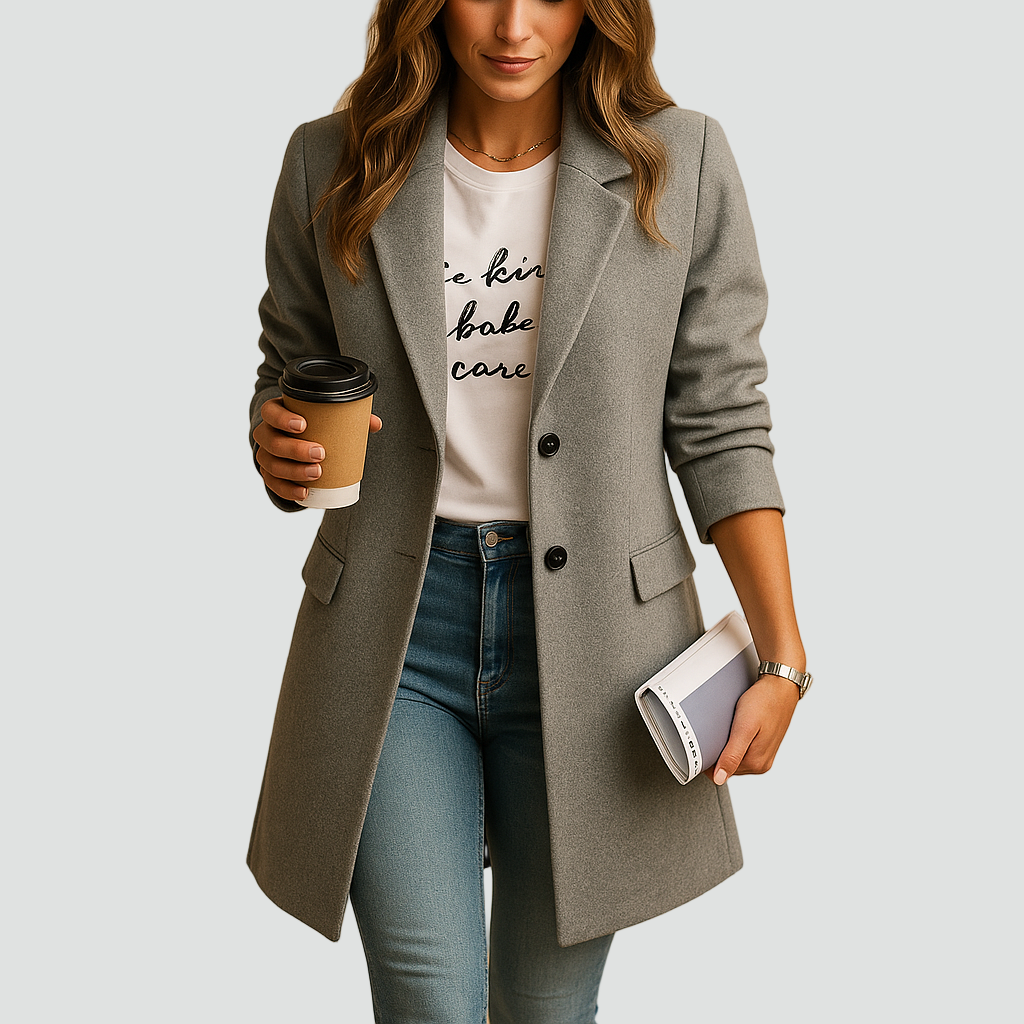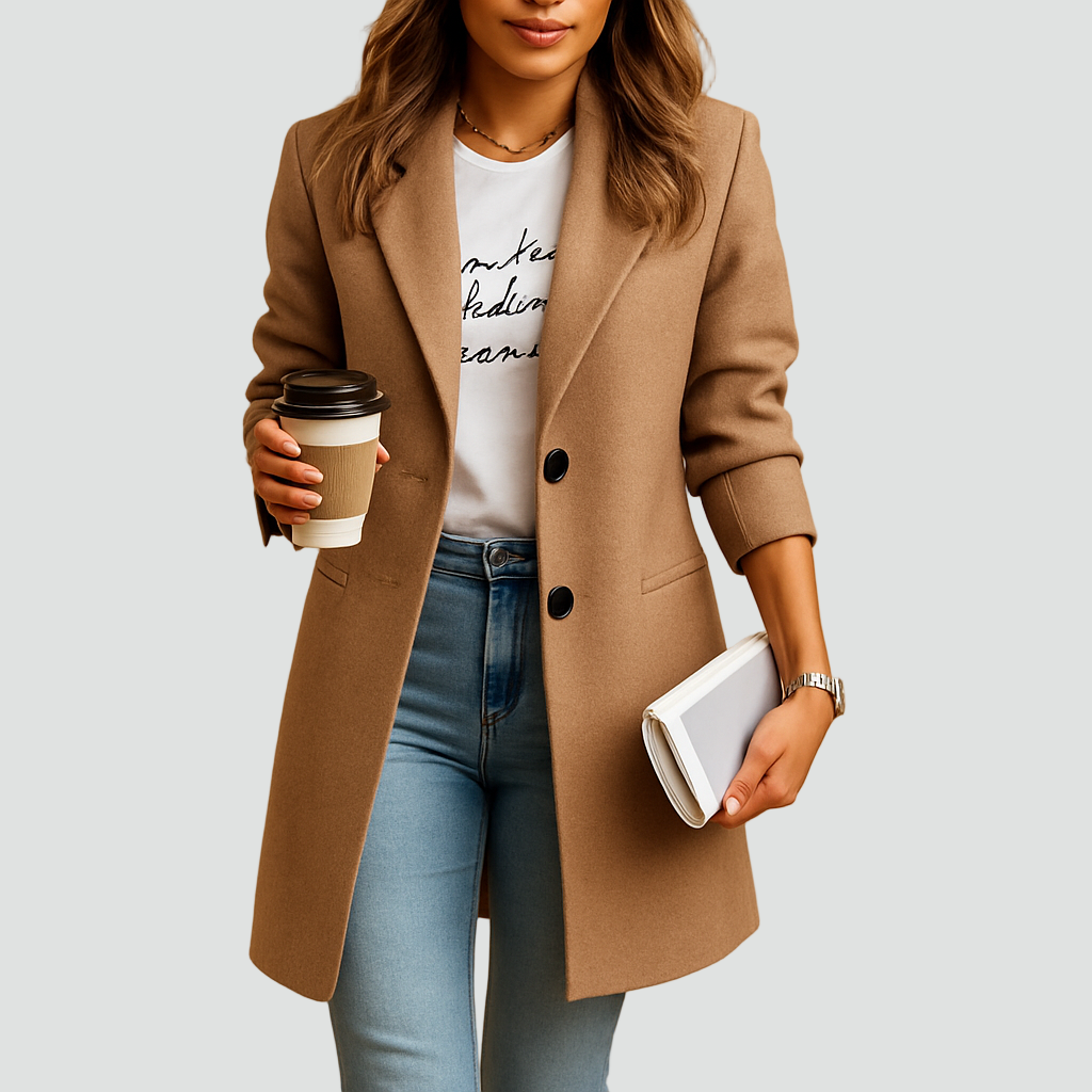 Stylowy, ponadczasowy płaszcz, który podkreśla kobiecy charakter każdej stylizacji. Wykonany z miękkiej tkaniny o strukturze wełny, zapewnia ciepło i komfort w chłodniejsze dni. Klasyczny krój z kołnierzem i zapięciem na guziki dodaje elegancji, a uniwersalna długość sprawia, że doskonale sprawdzi się zarówno na co dzień, jak i do pracy czy na spotkania.