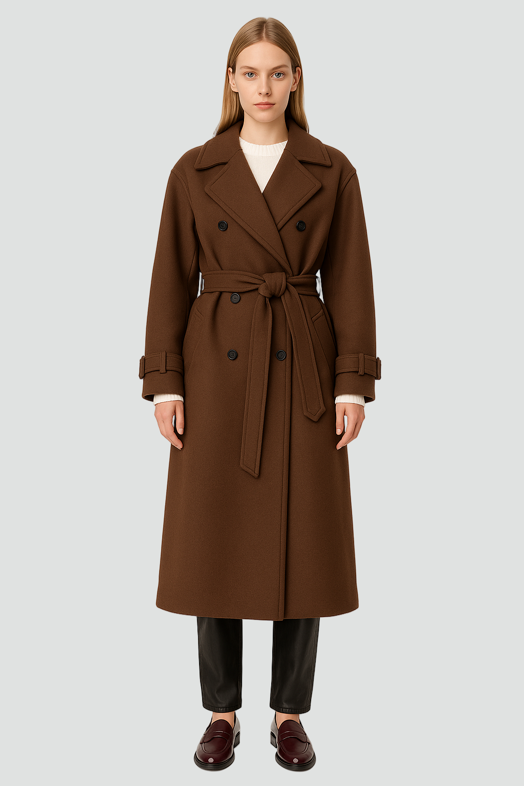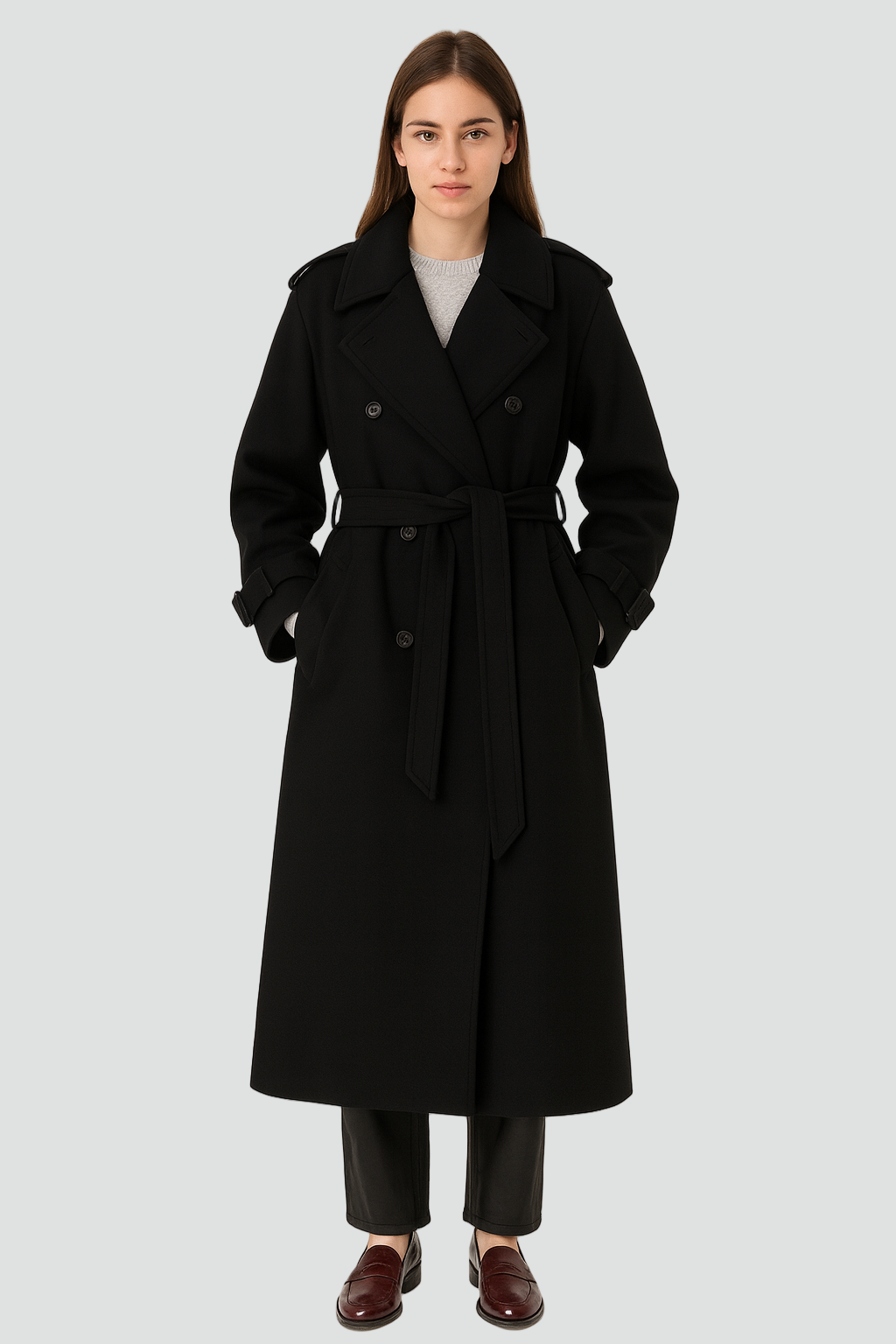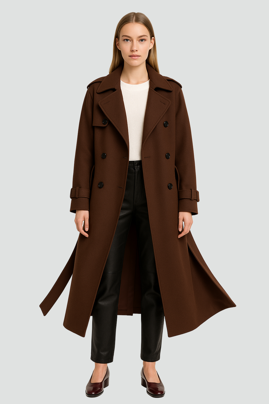 Ten klasyczny dwurzędowy damski trenchcoat zimowy z paskiem to płaszcz, który od razu robi wrażenie – wygląda elegancko, a jednocześnie jest praktyczny na chłodniejsze dni. Długa, prosta linia pięknie wysmukla sylwetkę, a pasek w talii pozwala dopasować fason do figury i dodać jej kobiecego charakteru. To idealny model do biura, na miasto czy wieczorne wyjście – wystarczy zmienić buty i dodatki.
