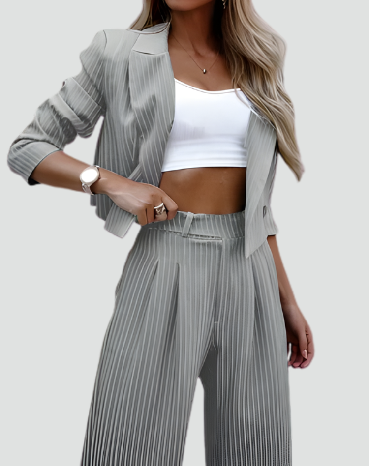 Damski garnitur biznesowy w paski z krótką marynarką i spodniami