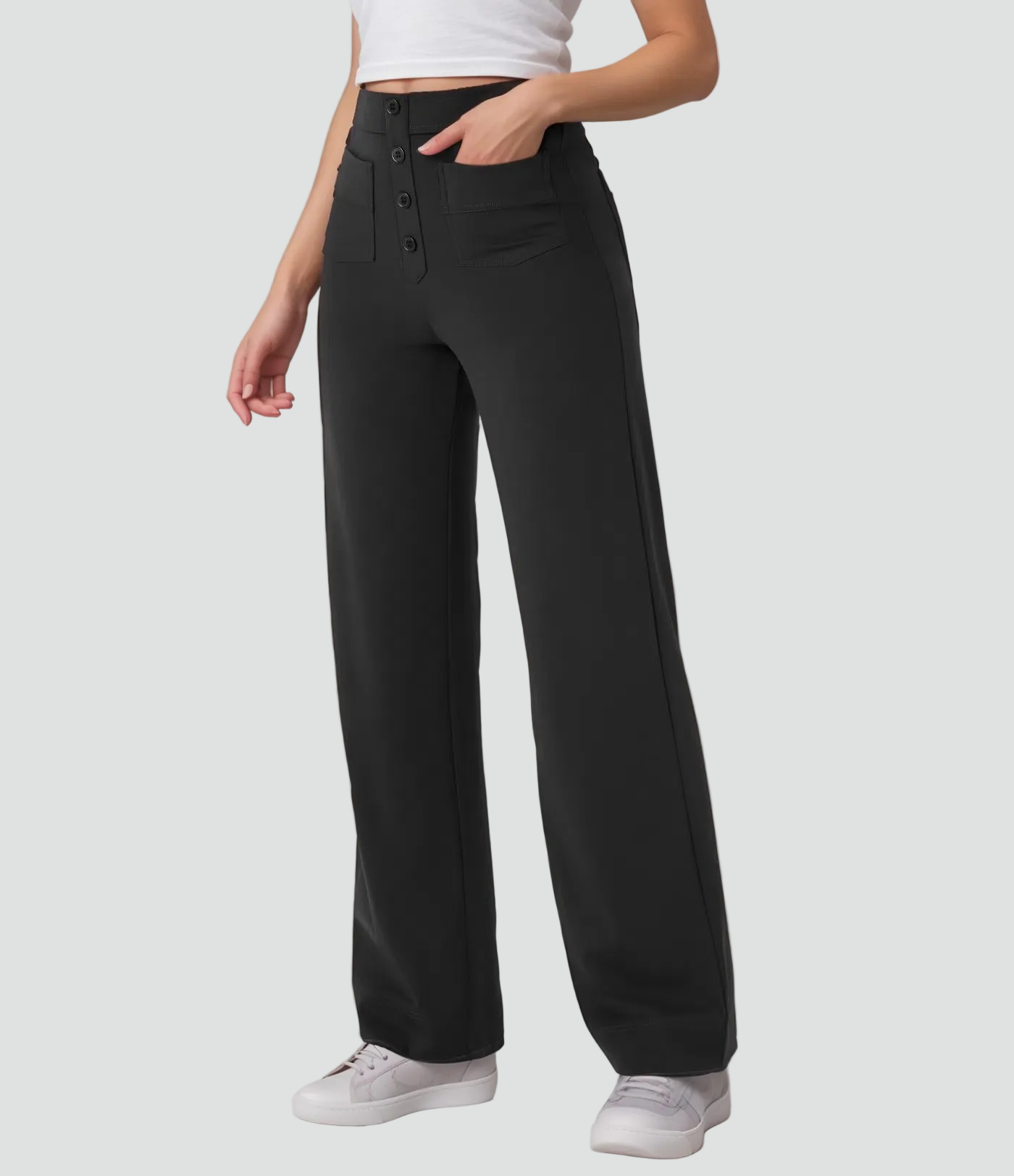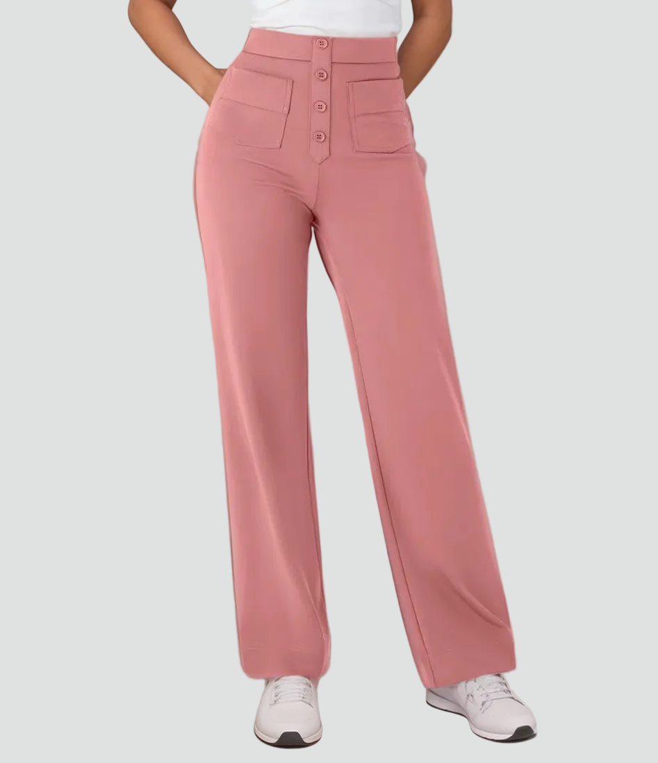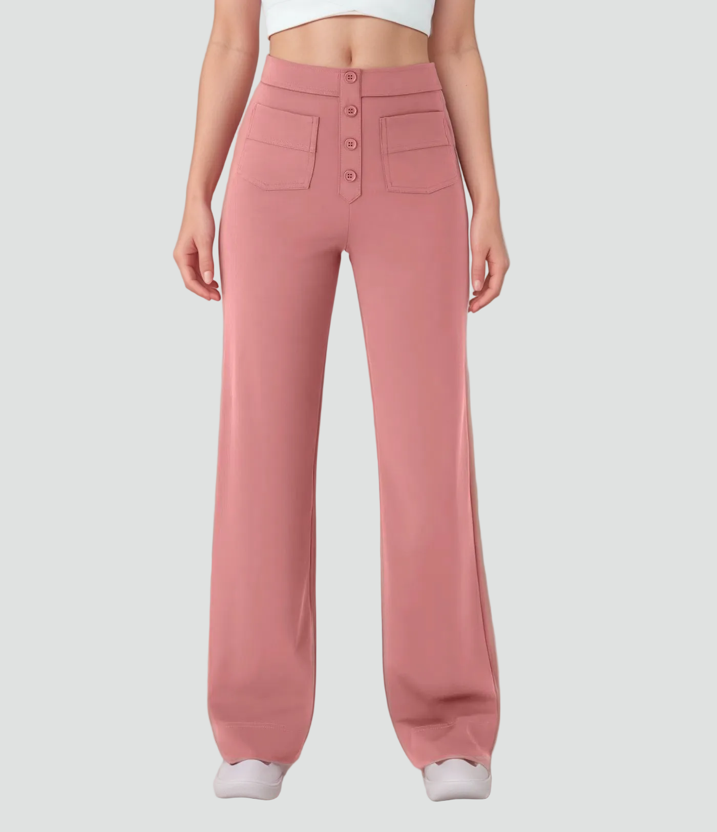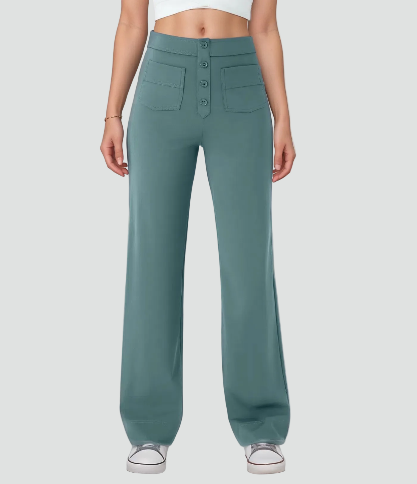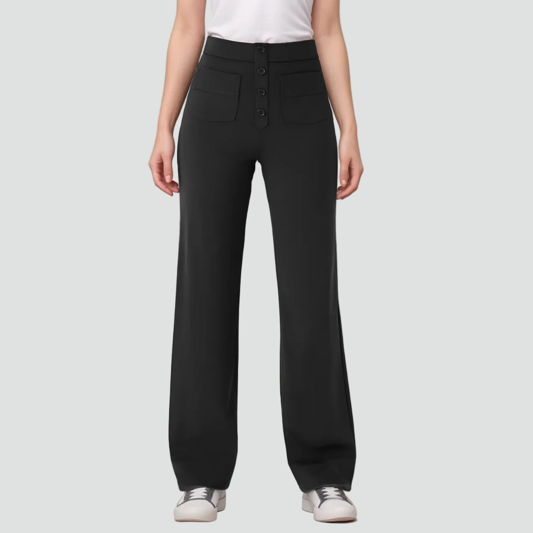 Te damskie spodnie z wysokim stanem zapinane na guziki to idealne połączenie wygody i modnego kroju. Wysoka talia ładnie zaznacza sylwetkę, a prosty krój nogawek subtelnie wydłuża nogi. Gładki przód i dekoracyjne guziki nadają im lekko elegancki charakter, dzięki czemu sprawdzą się i na co dzień, i do pracy, w zależności od tego, z czym je zestawisz.