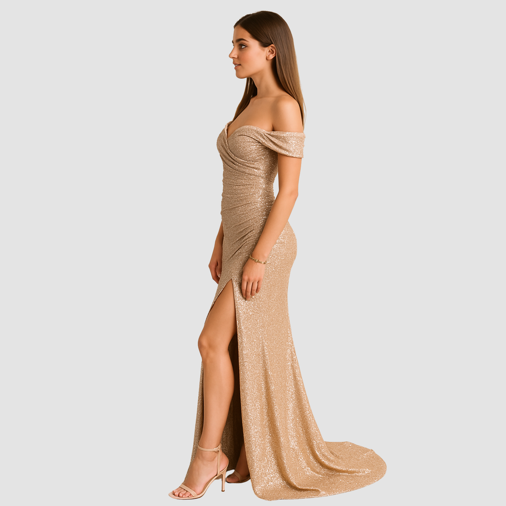 Cekinowa damska sukienka koktajlowa maxi z rozcięciem