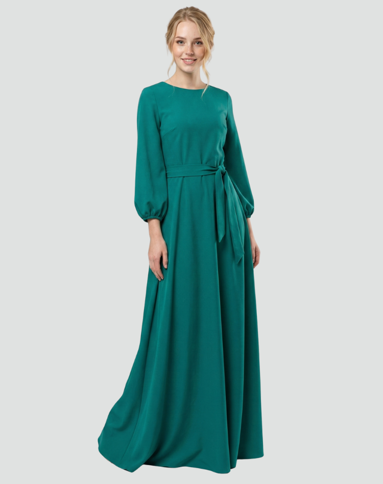 Romantyczna sukienka maxi party z paskiem i długim rękawem