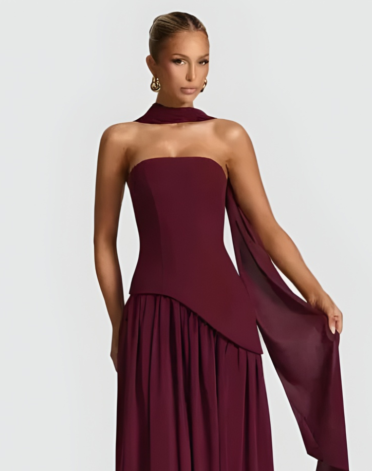 Sukienka maxi gala damska z asymetrycznym gorsetem i szalem