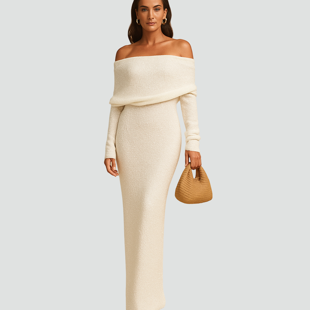 Długa dzianinowa sukienka z odkrytymi ramionami i długim rękawem