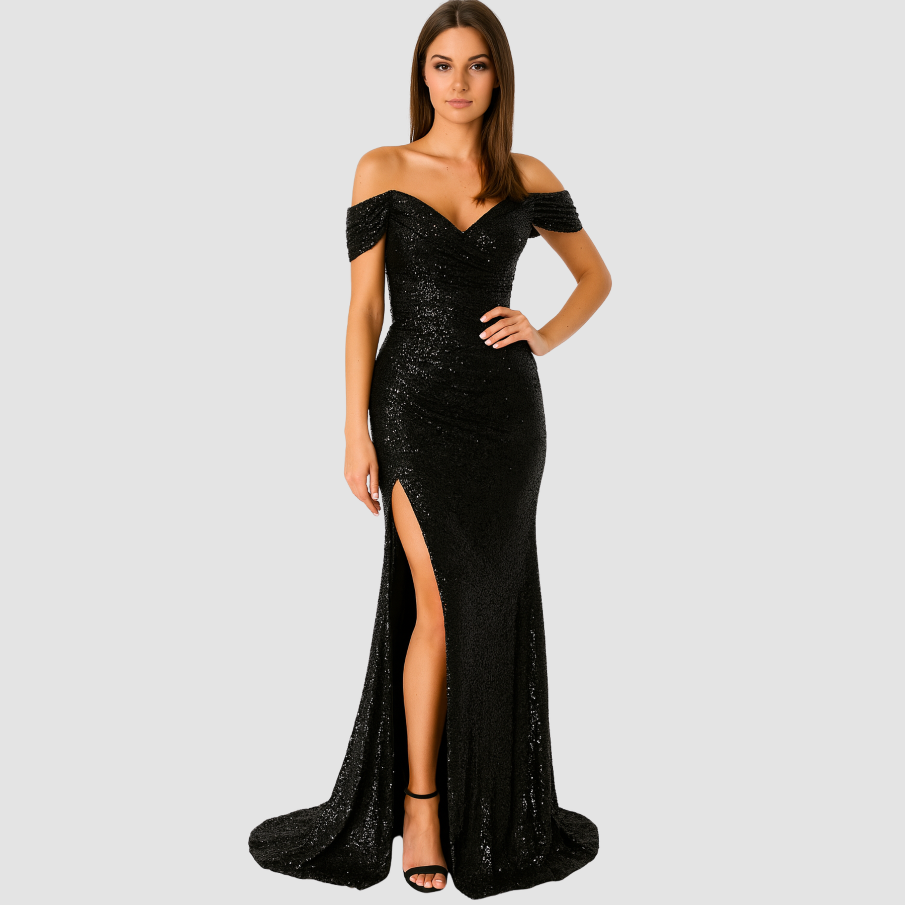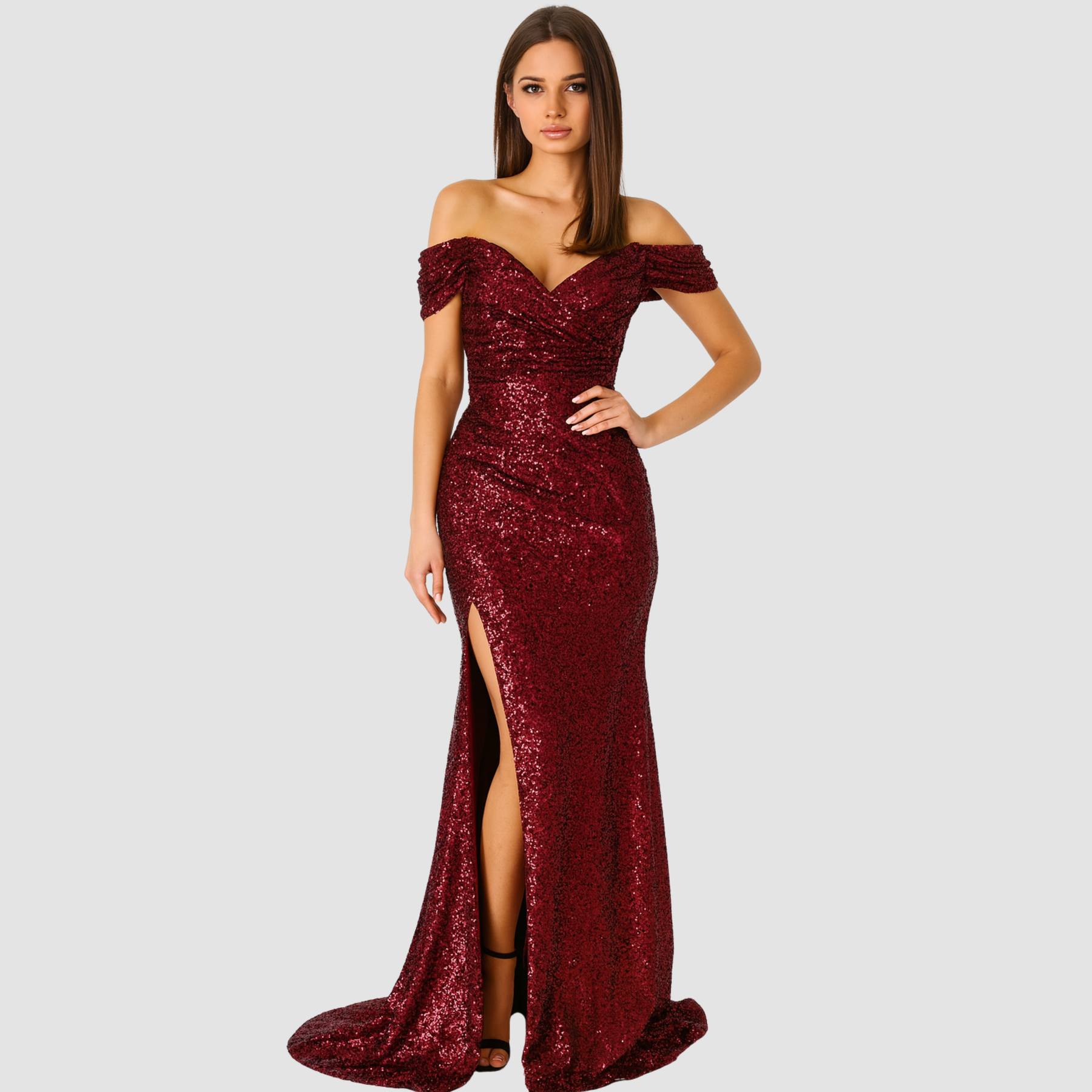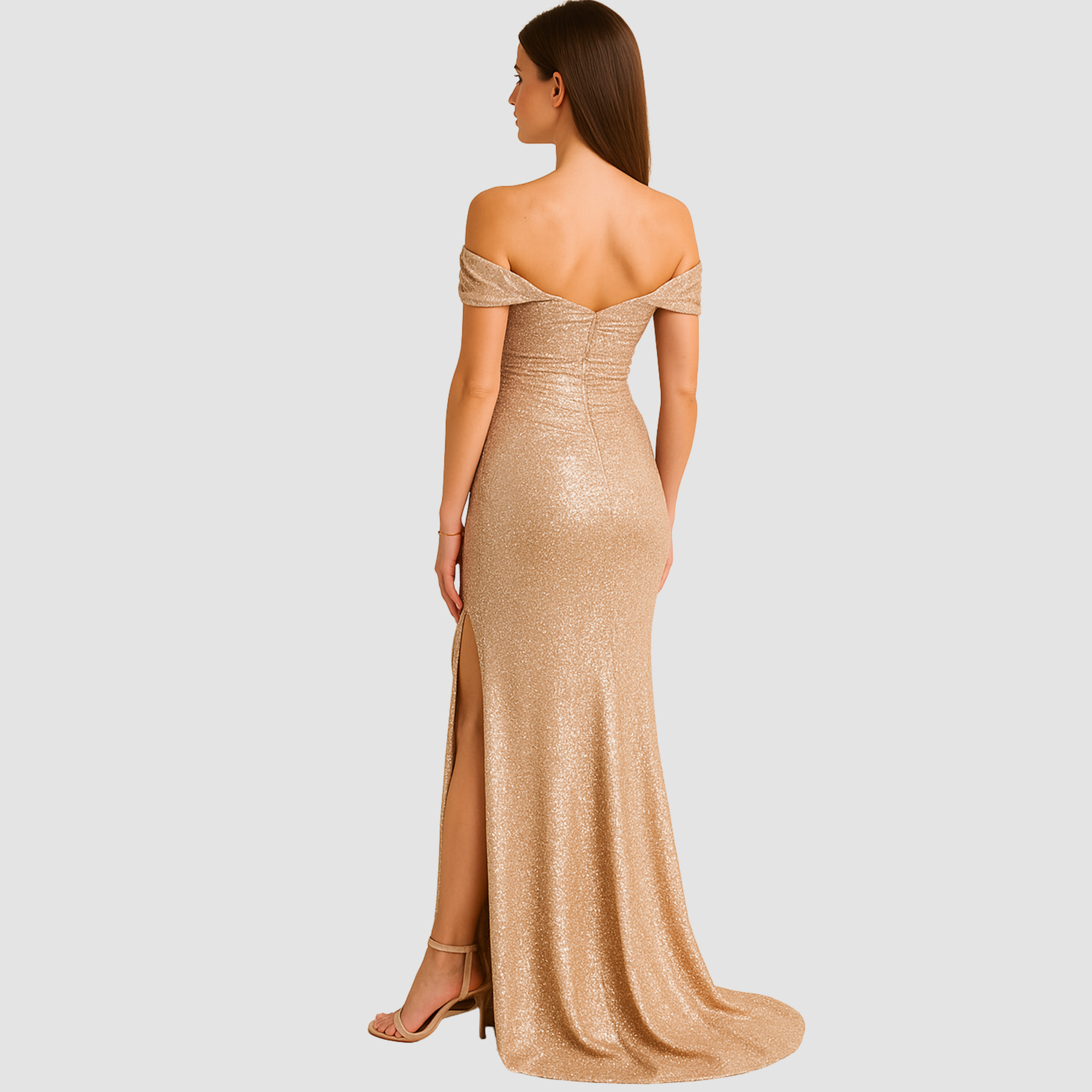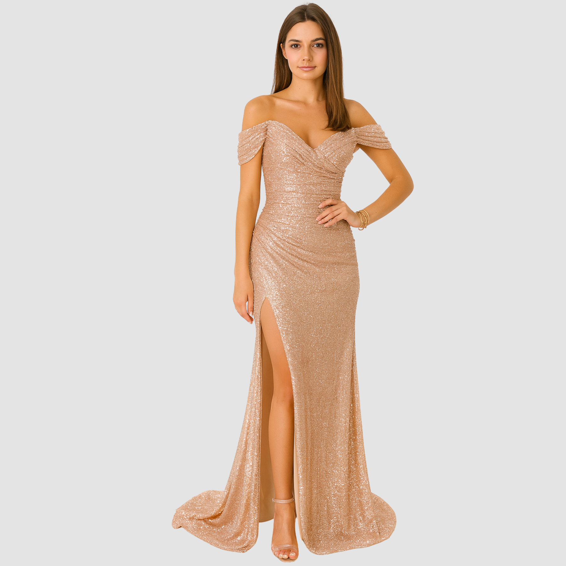 Ta cekinowa sukienka koktajlowa maxi z rozcięciem to idealna propozycja na wieczór, kiedy chcesz naprawdę zrobić wrażenie. Dopasowany krój podkreśla sylwetkę, a dekolt opadający na ramiona pięknie eksponuje szyję i obojczyki. Błyszczące cekiny cudownie łapią światło przy każdym ruchu, a wysokie rozcięcie dodaje całości lekkości i odrobiny zmysłowości. Wystarczą szpilki, delikatna biżuteria i mała torebka, żeby stworzyć look gotowy na przyjęcie, wesele czy bal.