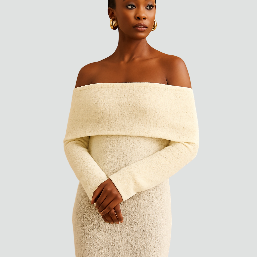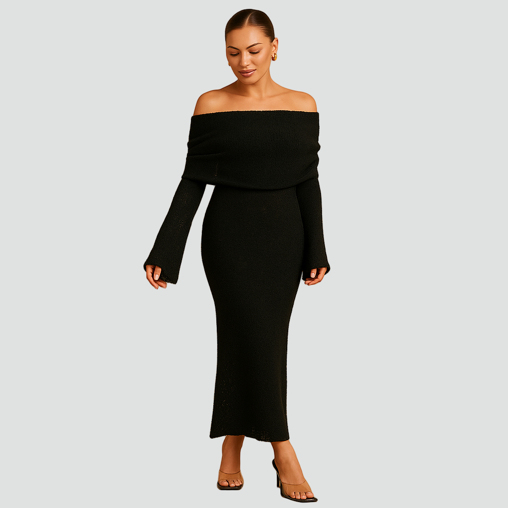 Długa dzianinowa sukienka z odkrytymi ramionami i długim rękawem