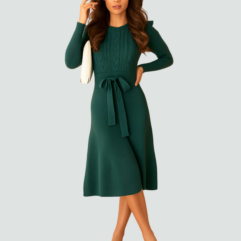 Dzianinowa sukienka midi z paskiem w talii i długim rękawem