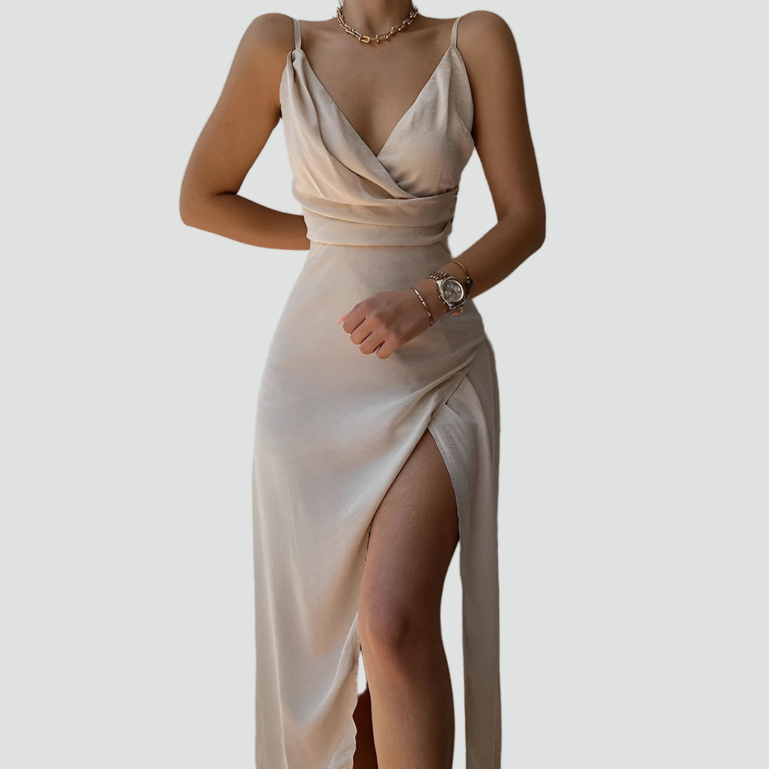 Ta elegancka długa sukienka koktajlowa to model, w którym od razu czujesz się bardziej kobieco. Delikatne ramiączka i dekolt w kształcie litery V ładnie podkreślają ramiona, a dopasowana góra przechodzi w miękko opadający dół z rozcięciem, które subtelnie odsłania nogę. Wystarczy dodać ulubione szpilki i biżuterię, żeby mieć gotową stylizację na wesele, randkę czy wieczorne wyjście.