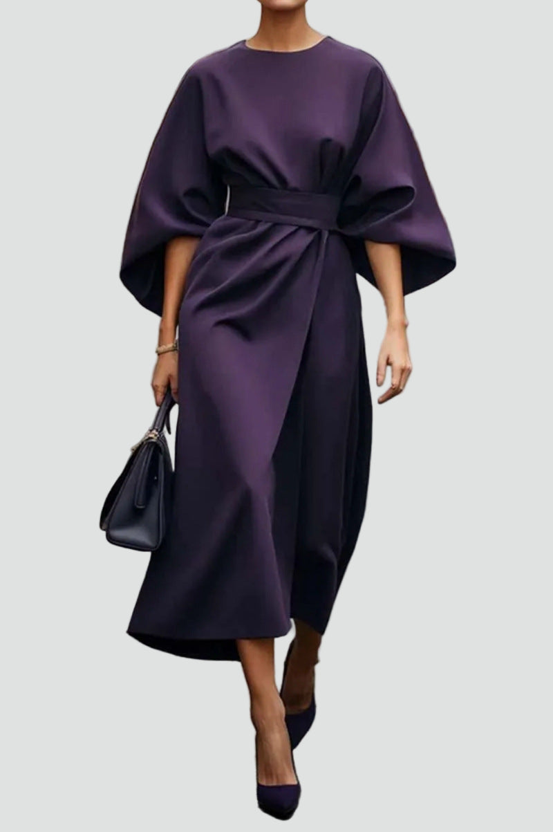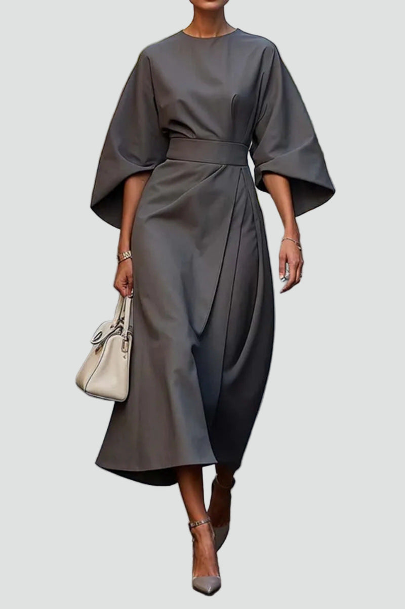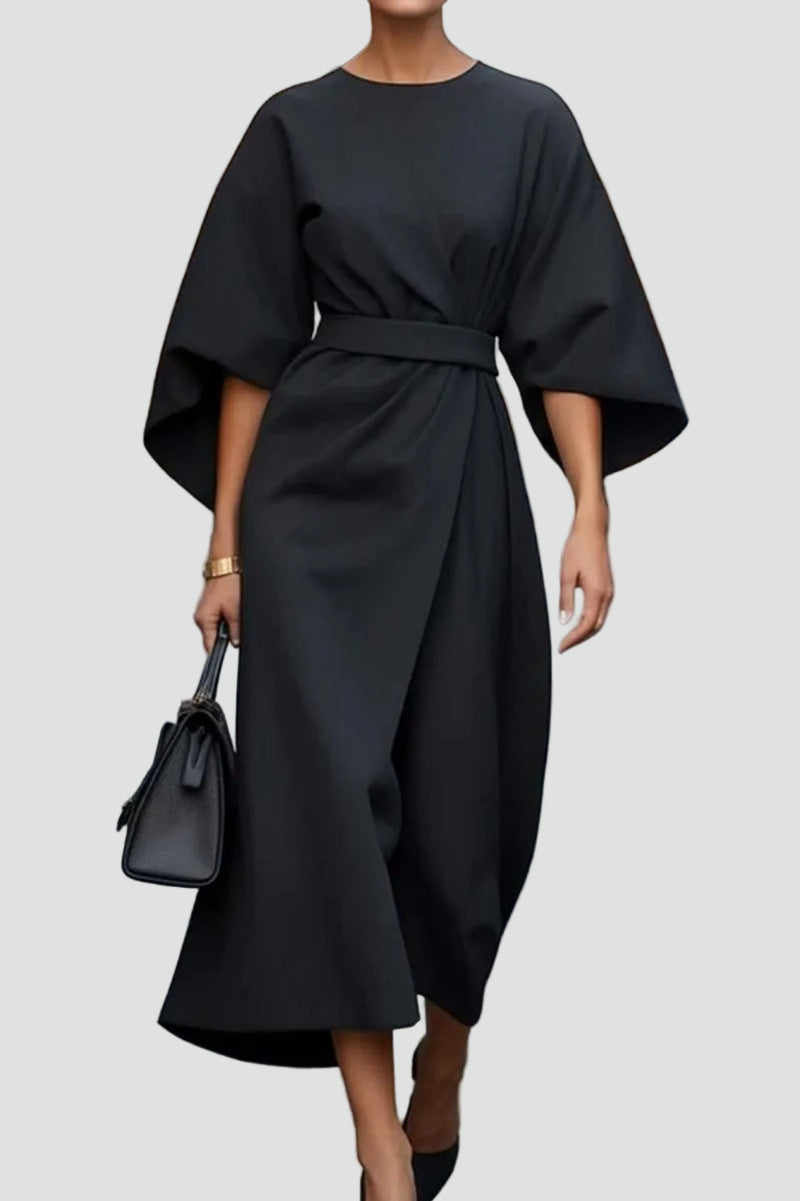 Ta elegancka sukienka midi to model, w którym równie dobrze pójdziesz do pracy, jak i na kolację czy przyjęcie koktajlowe. Prosty krój z dopasowaną talią i szerszym dołem pięknie układa się w ruchu, a szerokie rękawy nadają całości nowoczesnego, minimalistycznego charakteru. Pasek pozwala podkreślić talię na tyle, na ile lubisz, dzięki czemu łatwo dopasujesz sukienkę do swojej sylwetki i okazji.