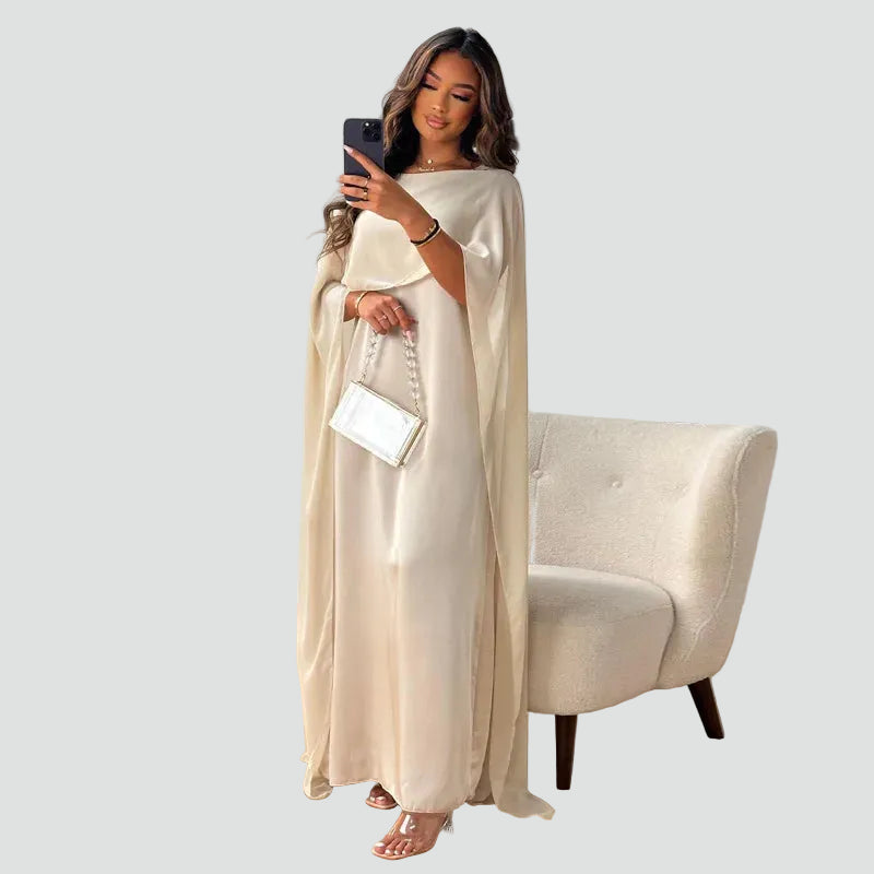 Ta elegancka sukienka maxi z pelerynowym rękawem to idealna propozycja na wyjątkowe okazje, kiedy chcesz wyglądać dostojnie i nowocześnie jednocześnie. Gładka, lejąca tkanina pięknie układa się przy każdym kroku, a luźno opadająca peleryna tworzy efekt subtelnego płaszcza, który dodaje stylizacji klasy. Prosty krój podkreśla sylwetkę w delikatny sposób, nie opinając jej zbyt mocno, dzięki czemu możesz czuć się swobodnie przez całą uroczystość. To kreacja, która doskonale sprawdzi się na weselach, galach, przyjęciach rodzinnych i wszystkich wieczornych wyjściach, gdy zależy ci na szykownym, ale wygodnym looku.