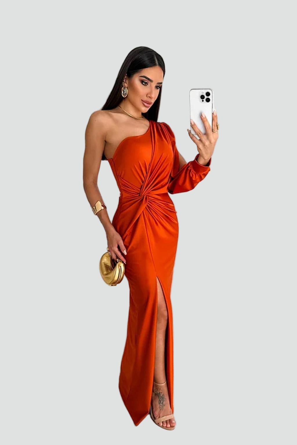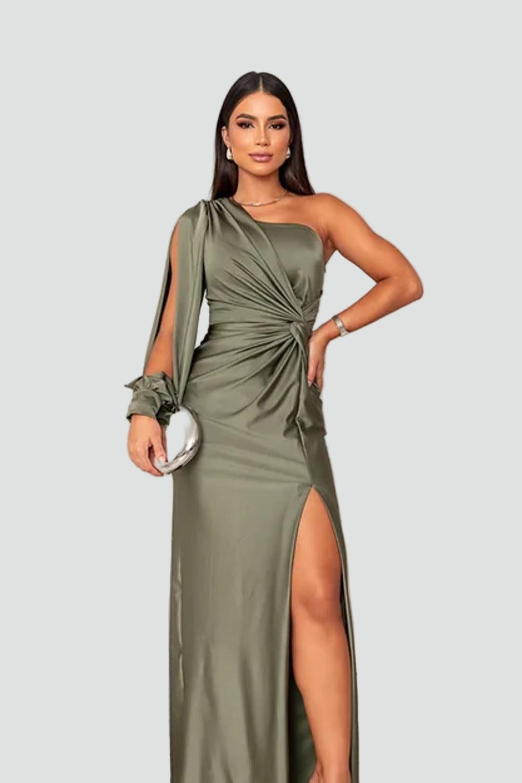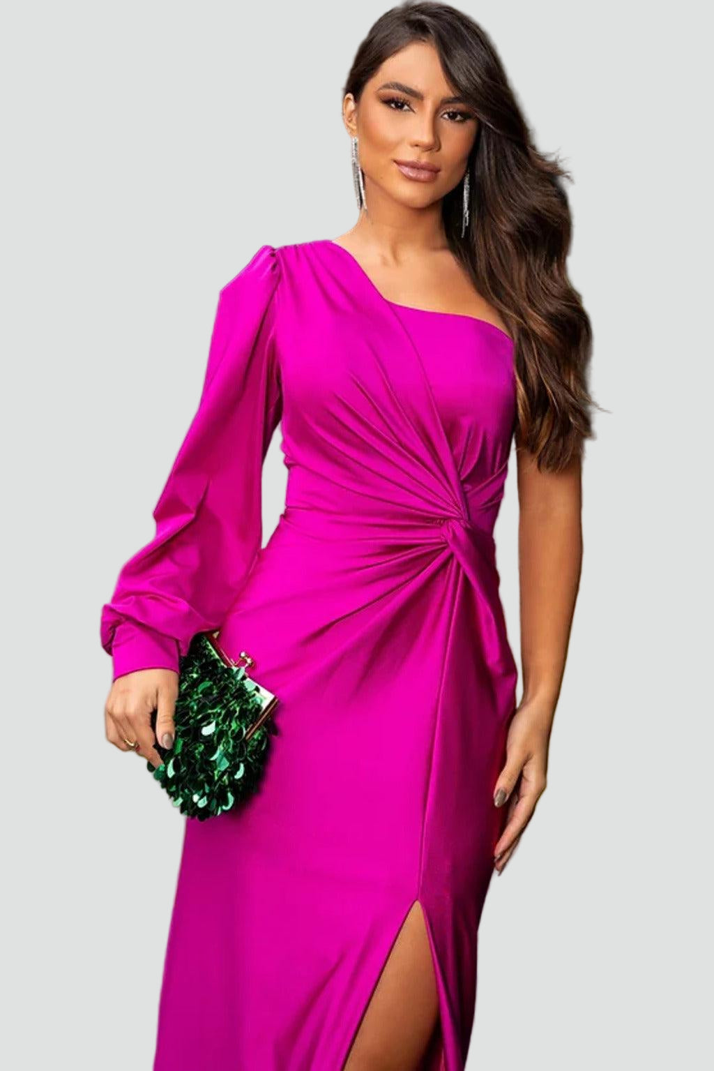 Ta długa sukienka wieczorowa na jedno ramię od razu robi efekt wow. Gładka, lekko połyskująca tkanina pięknie układa się na sylwetce, a marszczenie w talii podkreśla figurę i maskuje drobne niedoskonałości. Rozcięcie z przodu dodaje zmysłowości i sprawia, że to idealna propozycja na wesele, bal, galę czy eleganckie przyjęcie.