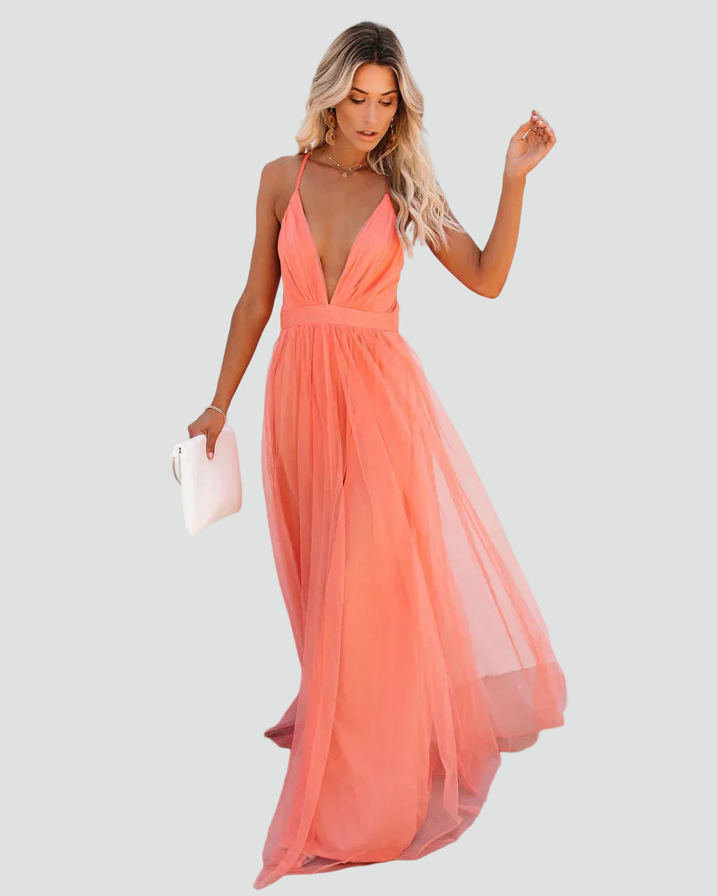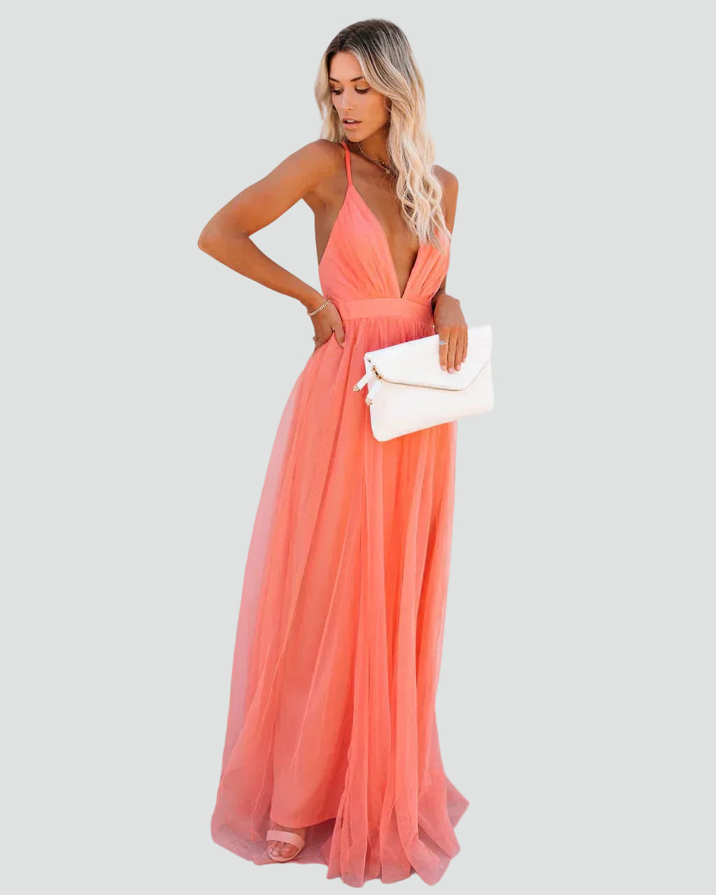 Ta koralowa sukienka maxi na ramiączkach z odkrytymi plecami to model, który wygląda lekko, kobieco i bardzo efektownie. Zwiewny fason pięknie układa się w ruchu, a odkryte plecy dodają całości subtelnie zmysłowego charakteru.