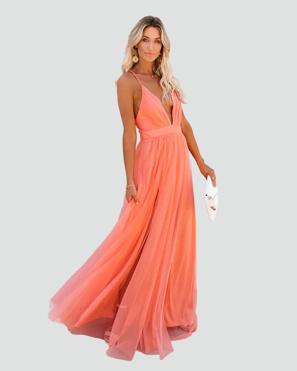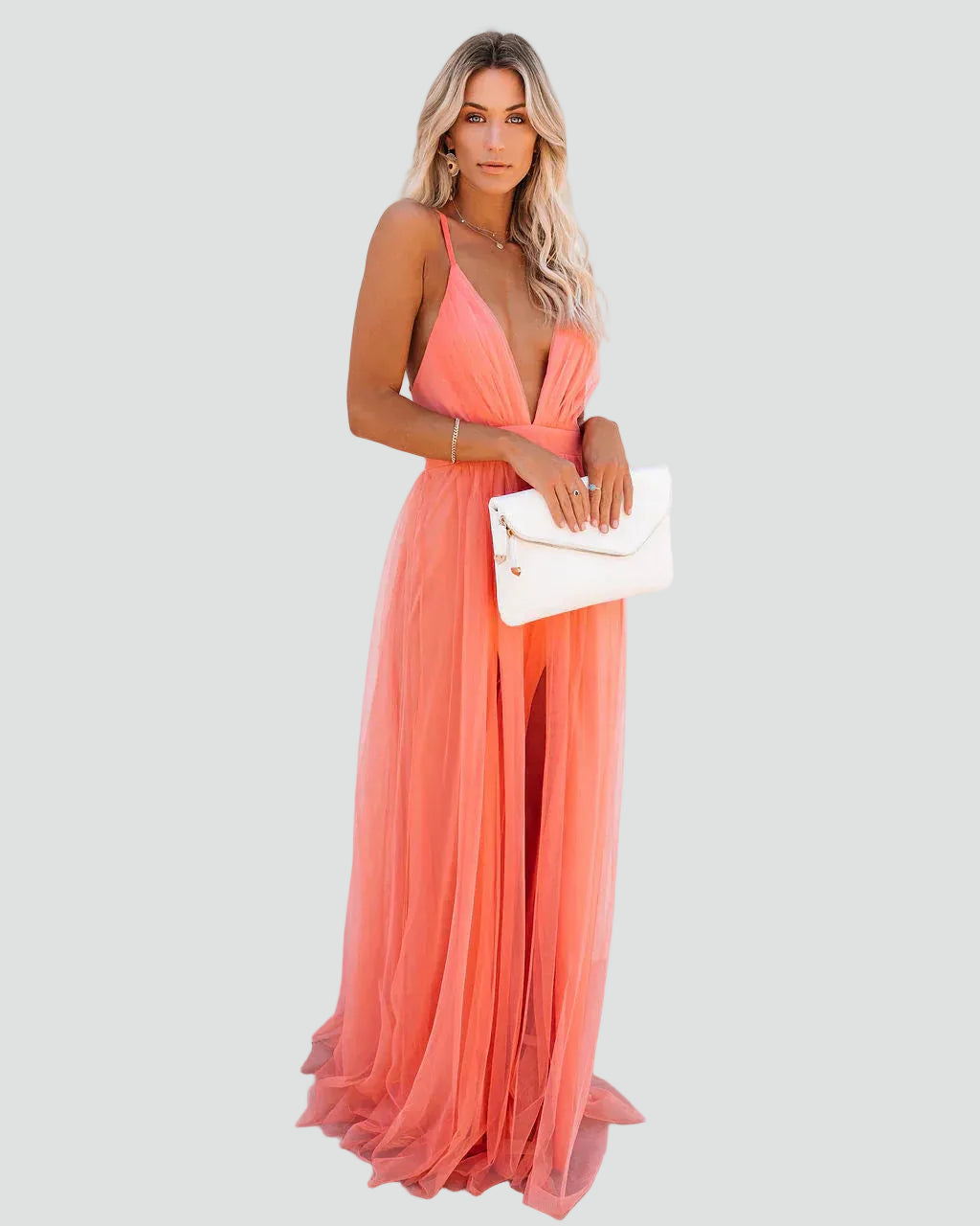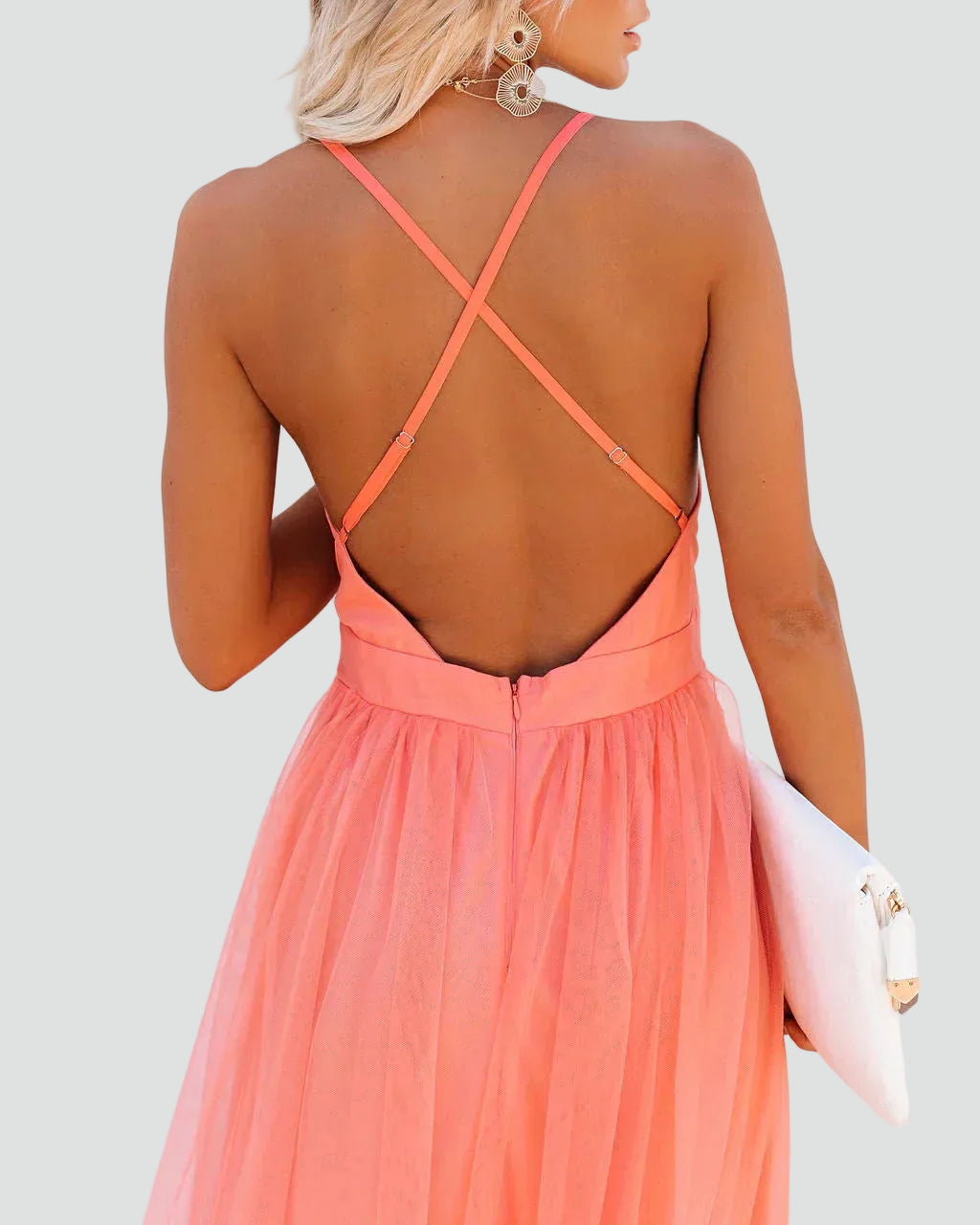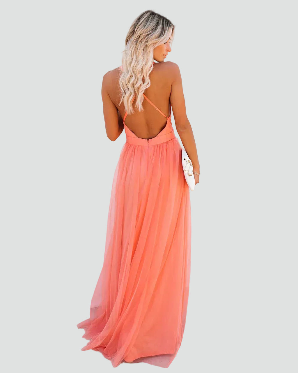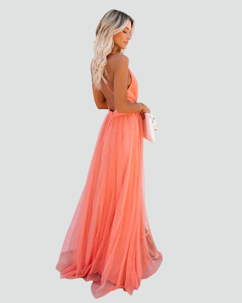 Koralowa sukienka maxi na ramiączkach z odkrytymi plecami