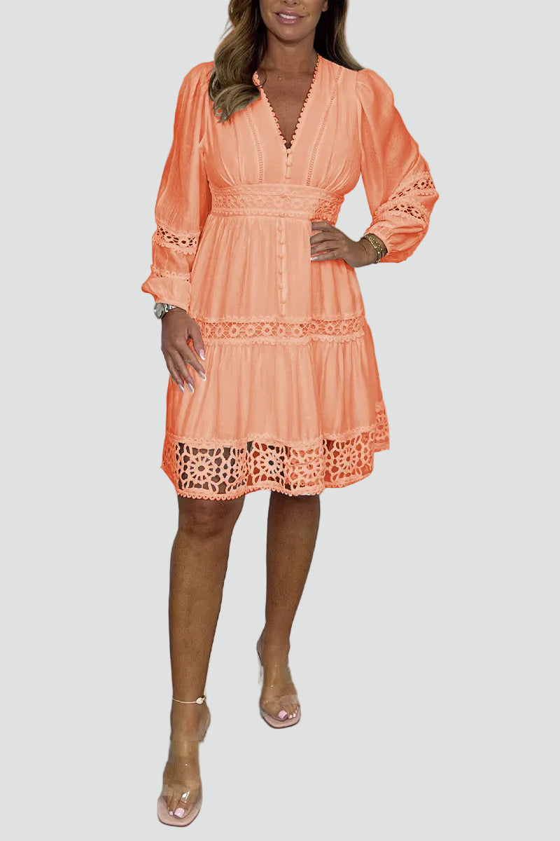 Ta letnia sukienka mini boho z koronką to mój wybór, kiedy chcę wyglądać romantycznie i świeżo, ale nadal na luzie. Ma elegancki dekolt V, delikatne guziczki i piękne detale broderie, które robią cały efekt, nawet bez mocnych dodatków. A do tego jest lekka i wygodna, więc spokojnie przetańczysz w niej całą imprezę.