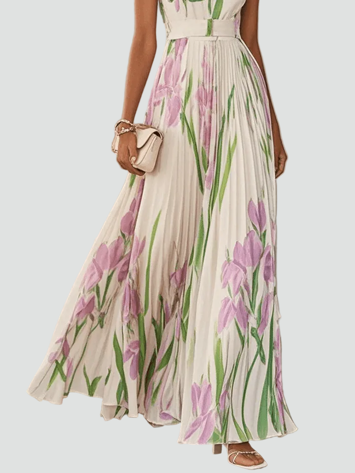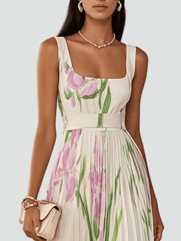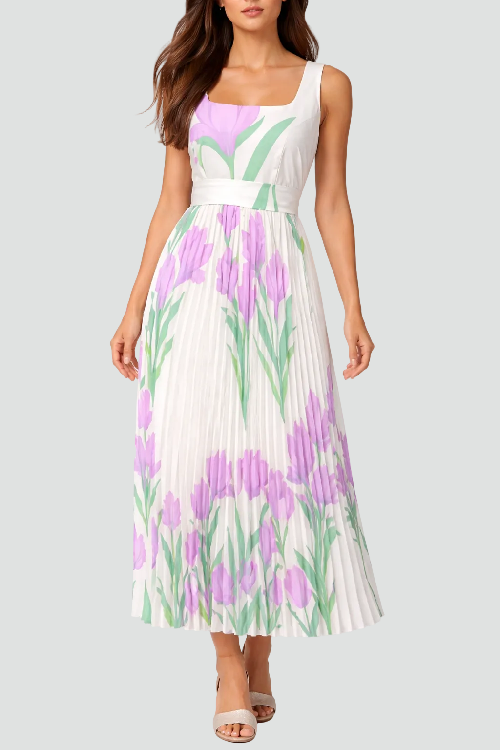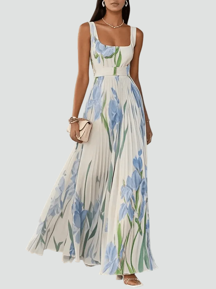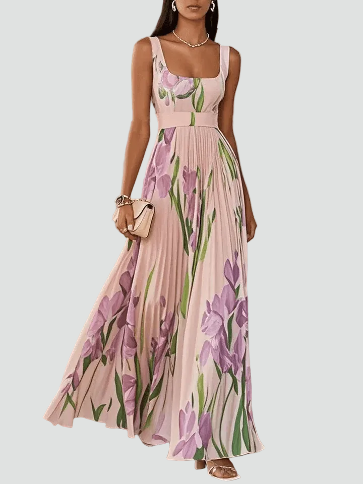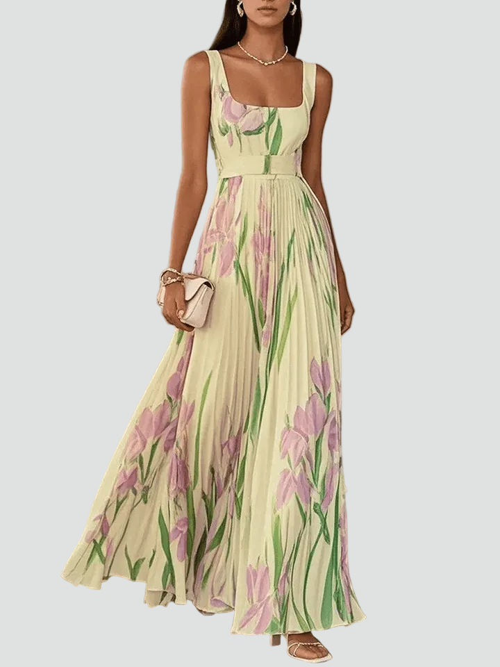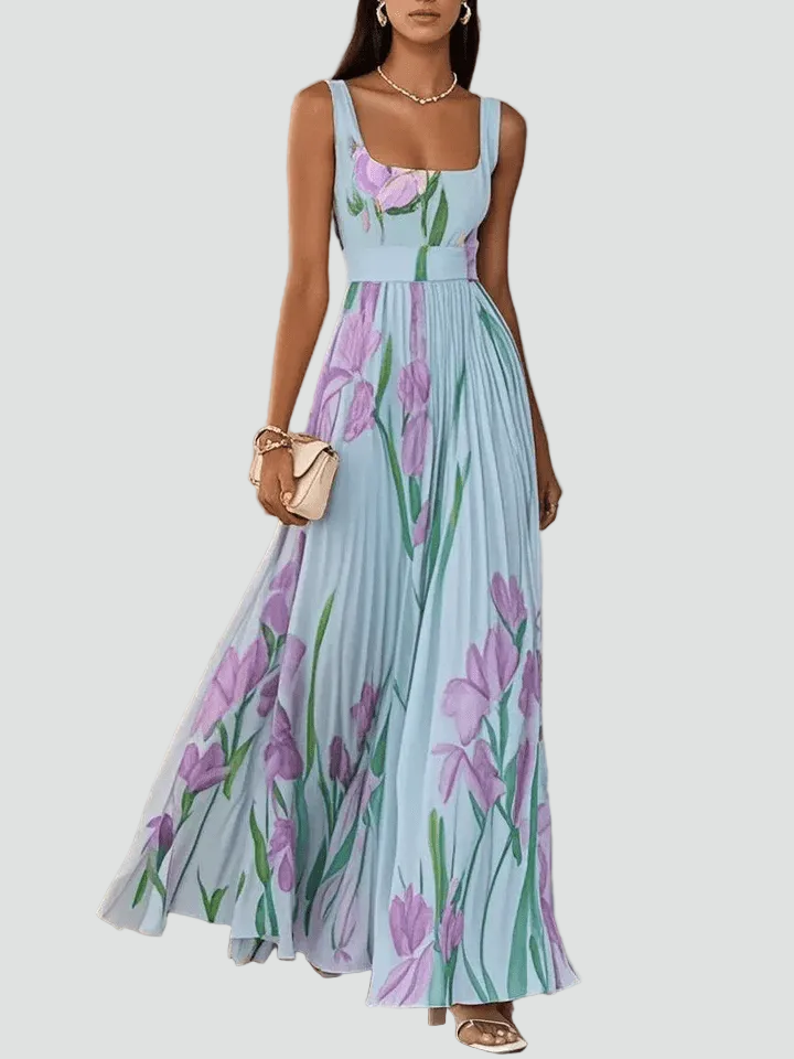Plisowana sukienka maxi bez rękawów na wesele w kwiaty z dekoltem kwadratowym
