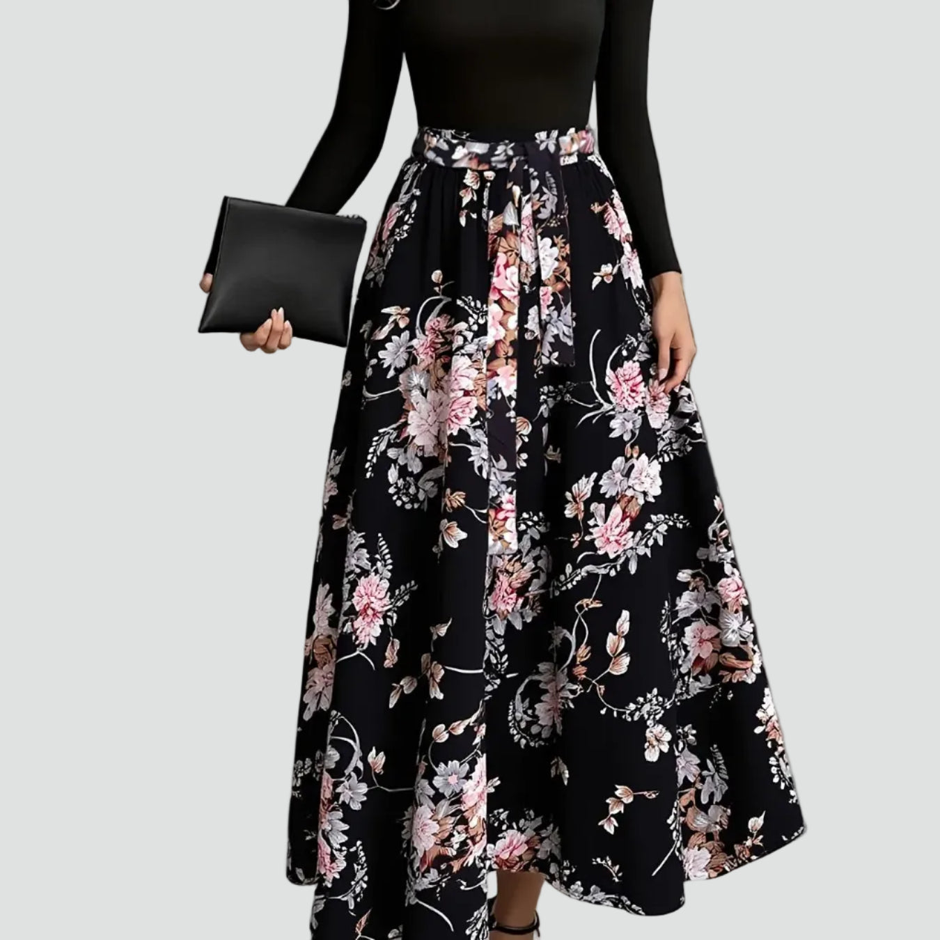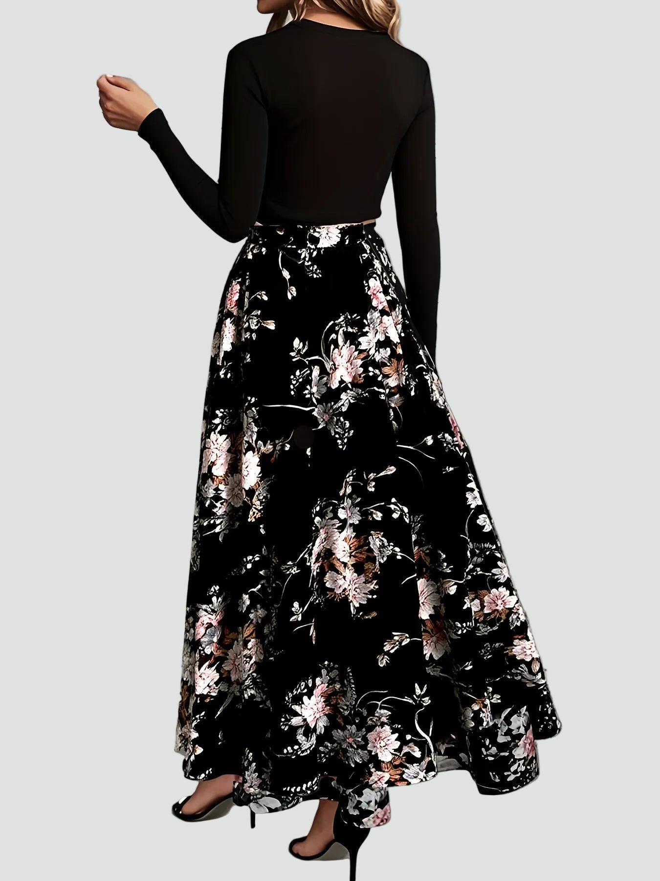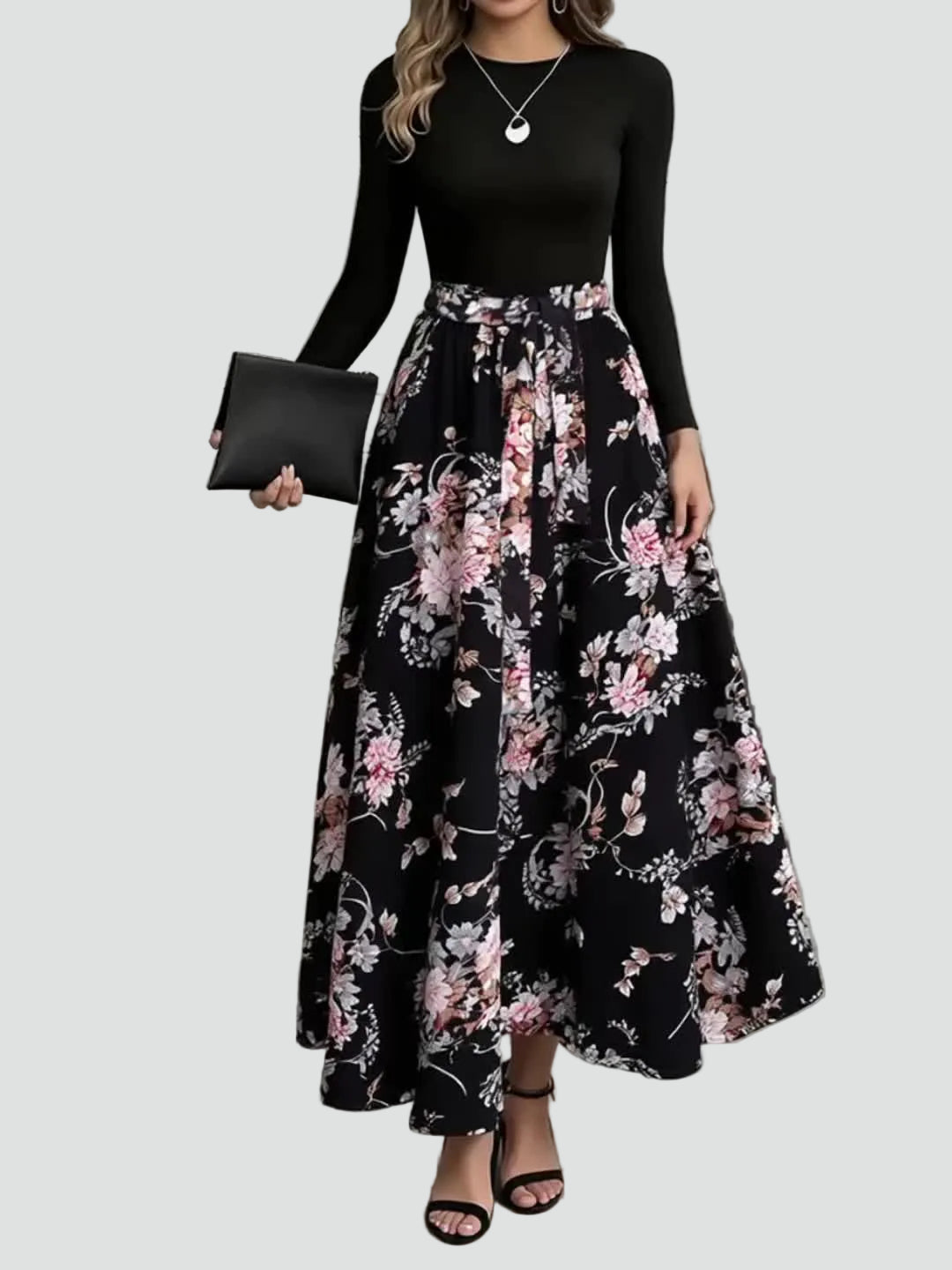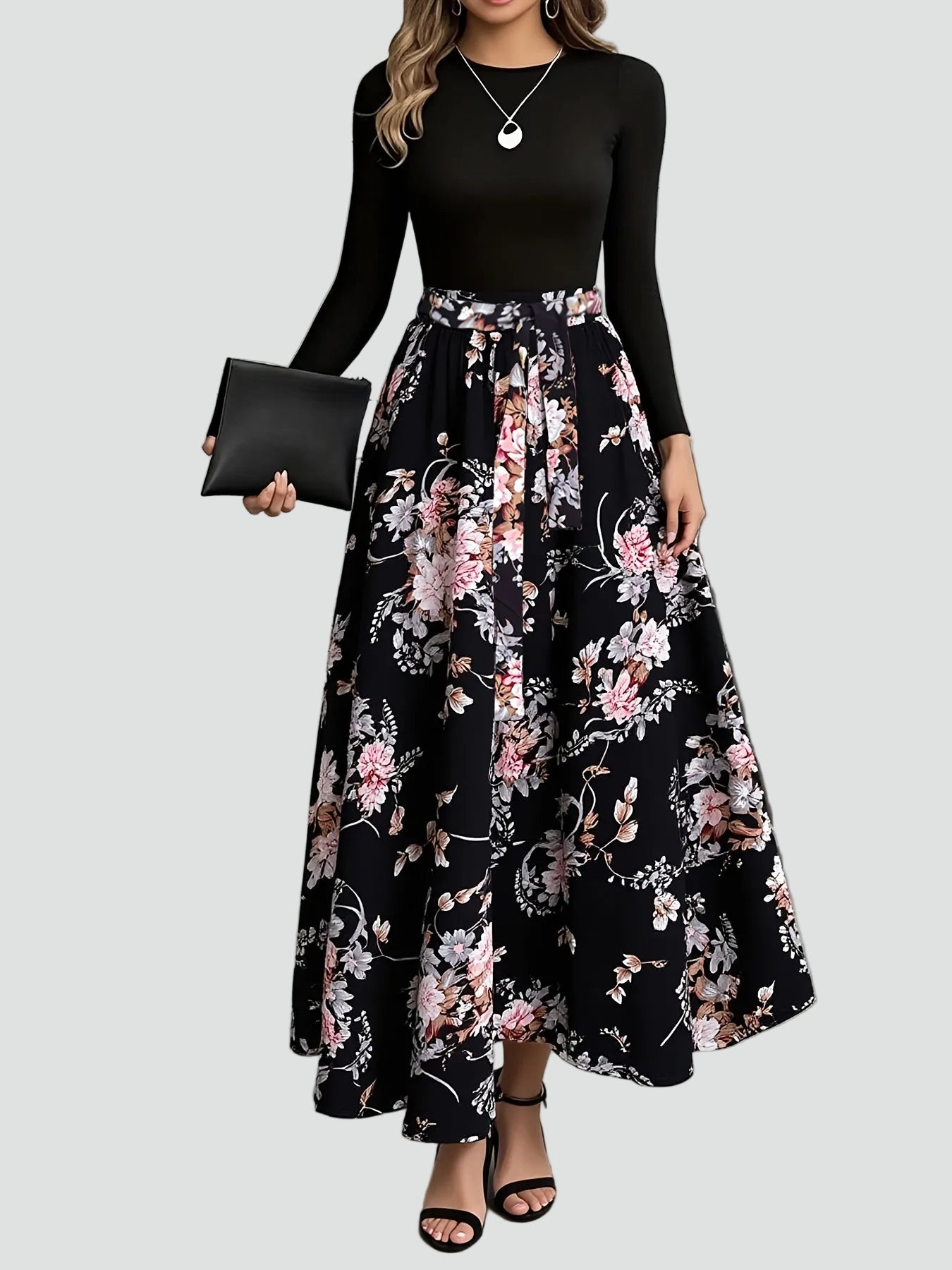 Romantyczna sukienka maxi party z paskiem i długim rękawem to idealna propozycja, kiedy chcesz wyglądać kobieco i elegancko, ale nadal czuć się swobodnie. Długość maxi robi piękny, szykowny efekt, kwiatowy wzór dodaje lekkości, a pasek w talii podkreśla sylwetkę, więc sprawdzi się na przyjęcia, rodzinne uroczystości i wieczorne wyjścia.