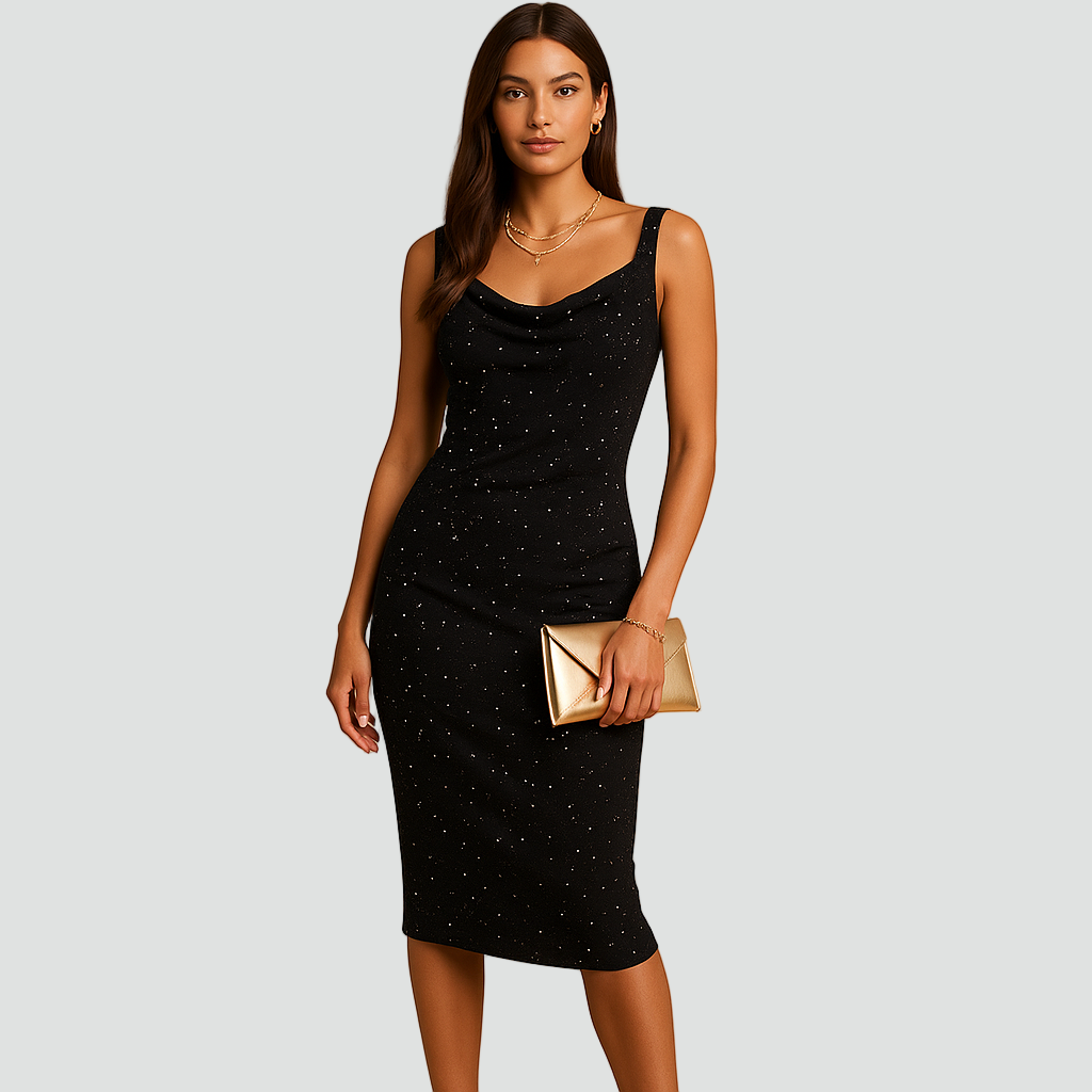 Olśniewająca i zmysłowa – ta sukienka midi bodycon to doskonały wybór na wyjątkowe okazje. Lśniący materiał z drobnym brokatem subtelnie odbija światło, a dopasowany krój pięknie podkreśla kobiece kształty. Dekolt typu woda dodaje elegancji i delikatnego uroku. Idealna na przyjęcia, kolacje lub wieczorne wyjścia.