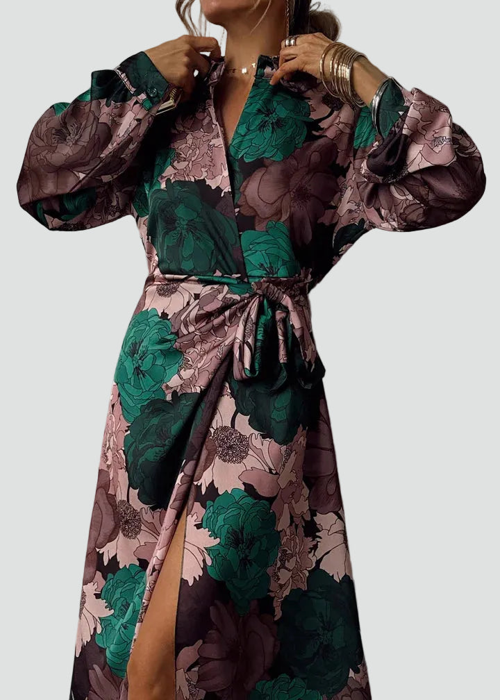 Elegancka sukienka w kwiaty, która w naturalny sposób łączy komfort i styl, idealna na przyjęcia, kolacje oraz specjalne okazje.