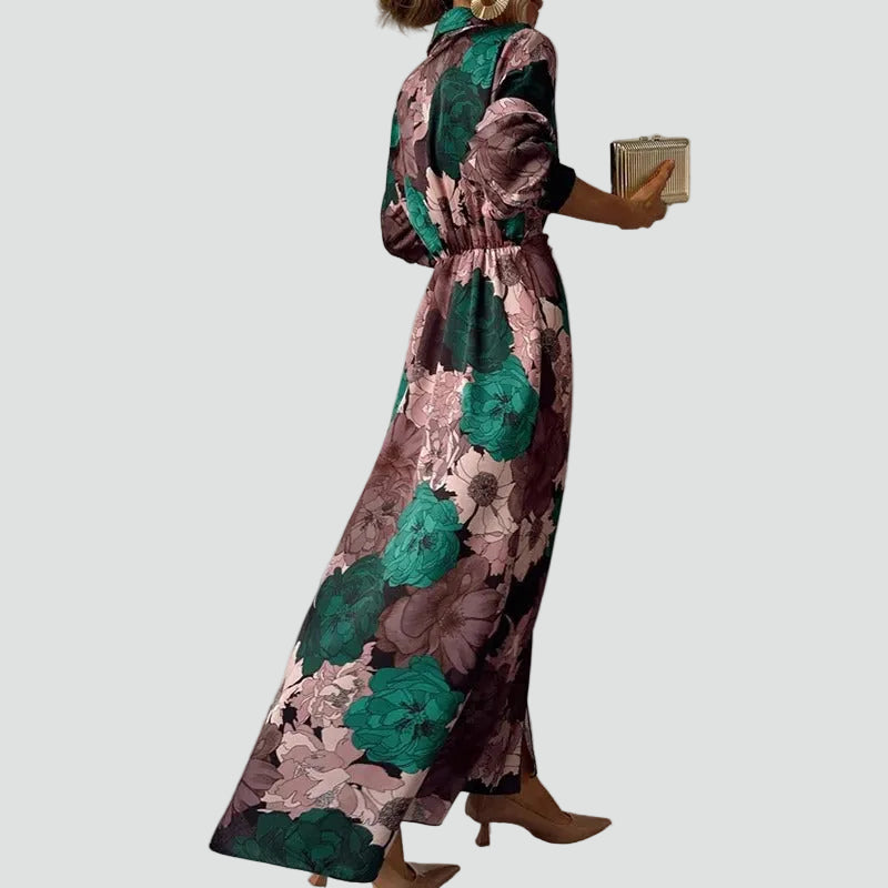 Ta elegancka maxi sukienka z kwiatowym nadrukiem jest idealnym wyborem na momenty, gdy chcesz wyglądać szykownie, a jednocześnie swobodnie. Lekko opadająca tkanina pięknie układa się przy każdym kroku, a wiązany pasek w talii podkreśla kobiecą sylwetkę. Dzięki kołnierzykowi i zapięciu na guziki sukienka zyskuje stylowy, lekko biznesowy charakter, który łatwo wystylizować zarówno ze szpilkami i kopertówką, jak i bardziej casualowo z sandałami.