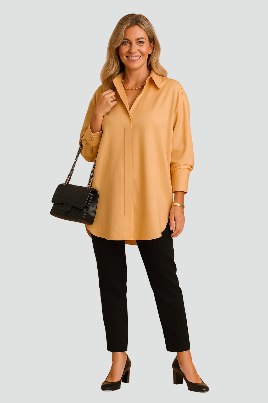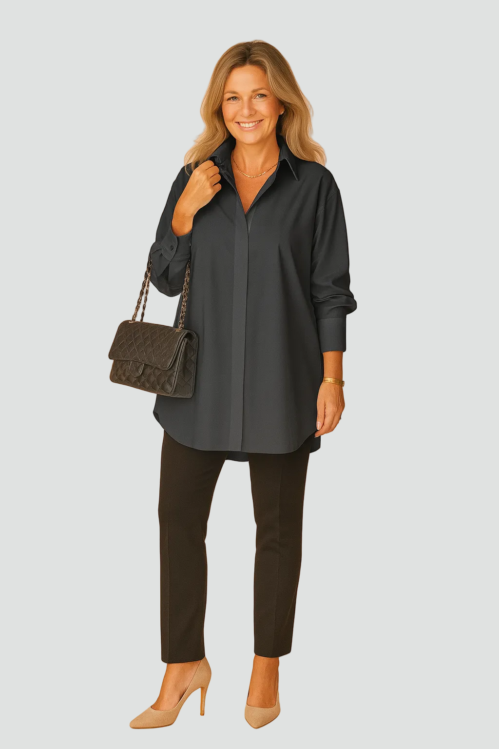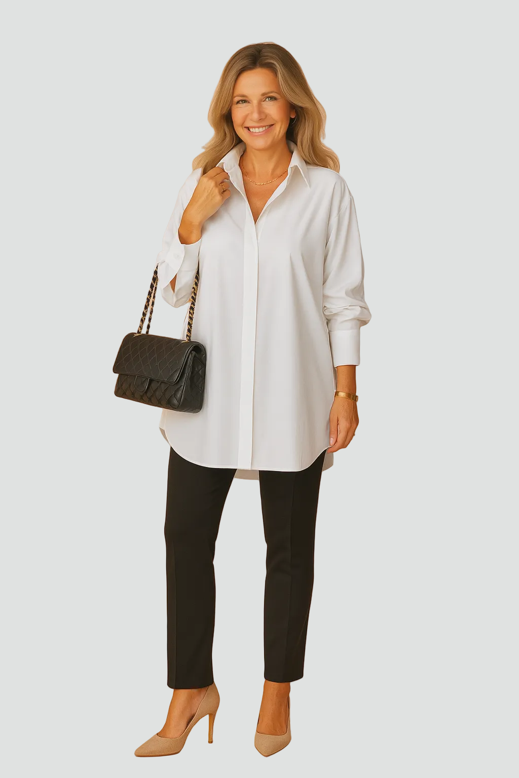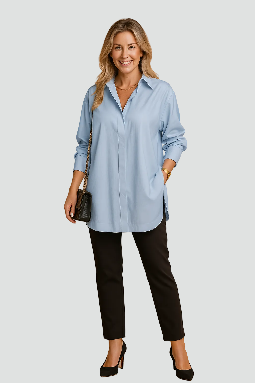 Ta długa elegancka tunikowa koszula damska oversize to taki fason, który od razu robi wrażenie, a jednocześnie jest niesamowicie wygodny. Luźny krój miękko opływa sylwetkę, maskuje to, co chcesz ukryć, i daje pełną swobodę ruchu przez cały dzień. Klasyczny kołnierzyk i dłuższy tył sprawiają, że koszula świetnie wygląda zarówno w biurze, jak i na luźniejsze wyjścia po pracy. Wystarczy założyć do niej proste spodnie, legginsy albo jeansy i masz gotowy zestaw, w którym czujesz się i schludnie, i na luzie.