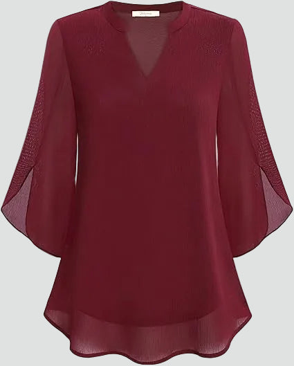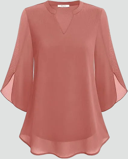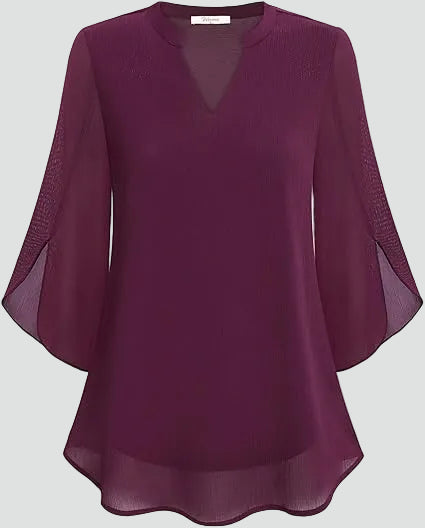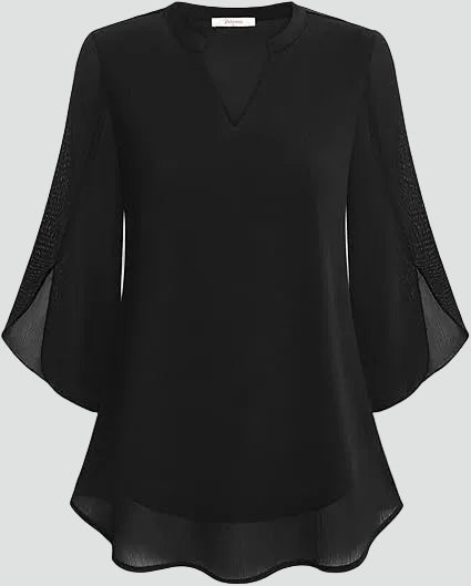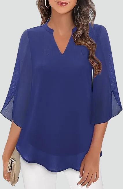 Ta elegancka bluzka damska z dekoltem V i rękawem 3/4 nadaje każdej stylizacji wyrafinowany, kobiecy charakter. Lekka tkanina miękko układa się na sylwetce, a delikatnie półprzezroczyste rękawy subtelnie osłaniają ramiona, nie ograniczając swobody ruchów. To idealny wybór do biura, na kolację czy specjalną okazję.