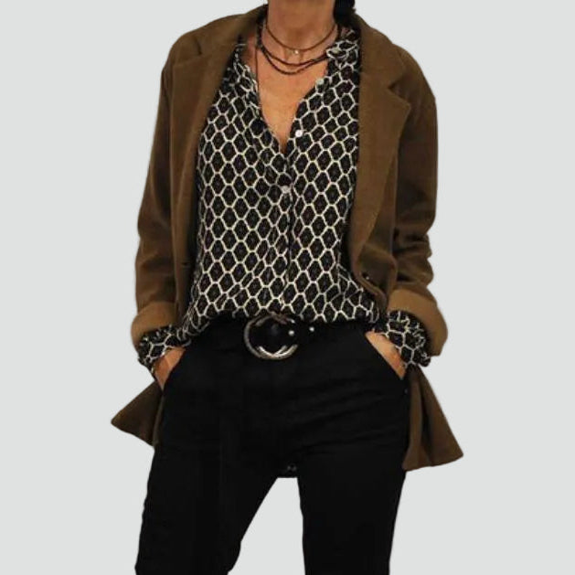 • Wyrazisty, geometryczny wzór robi efekt stylizacji sam z siebie i łatwo go zestawić z klasycznymi spodniami lub spódnicą