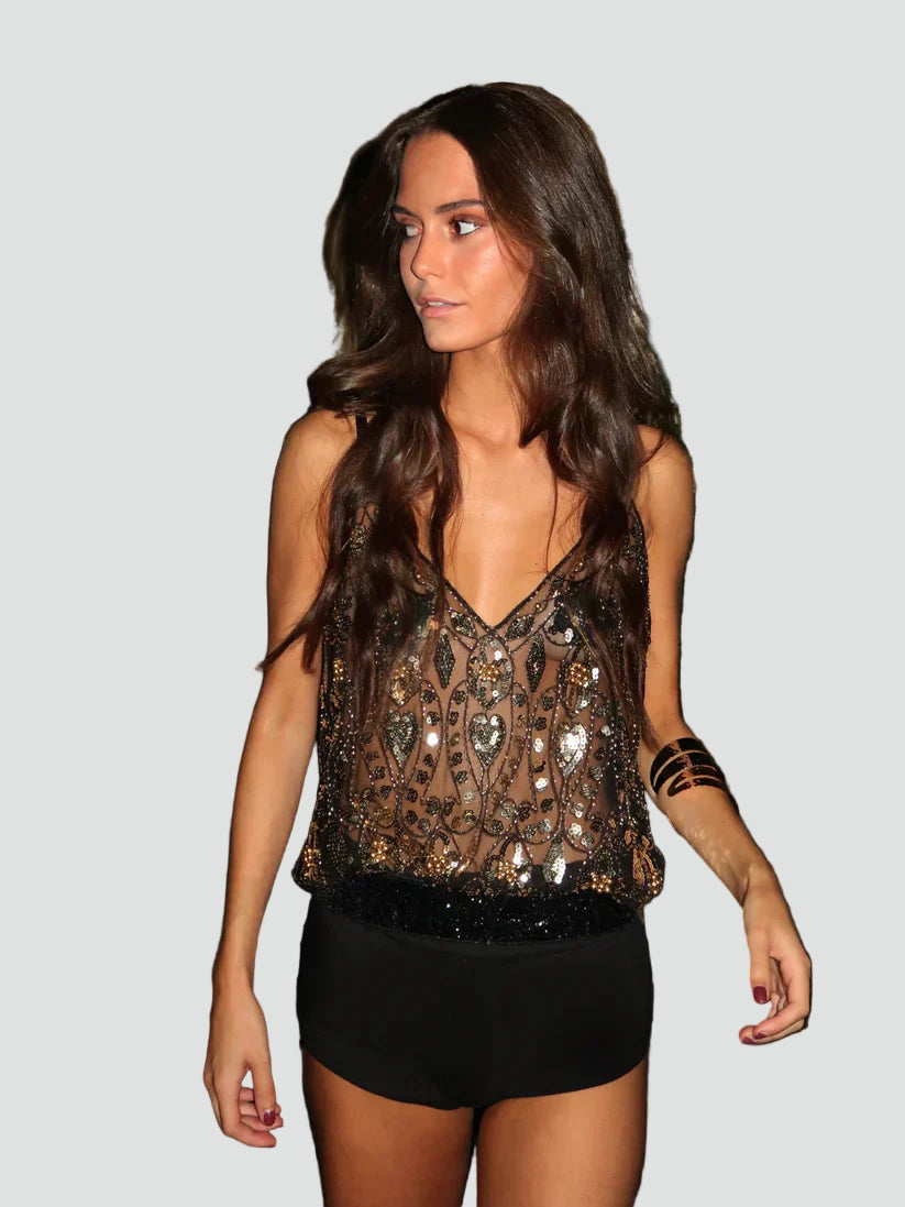 To top, po który sięgniesz za każdym razem, gdy chcesz dodać swojej imprezowej stylizacji odrobiny blasku i wyglądać jakbyś była gotowa na noc pełną wrażeń.