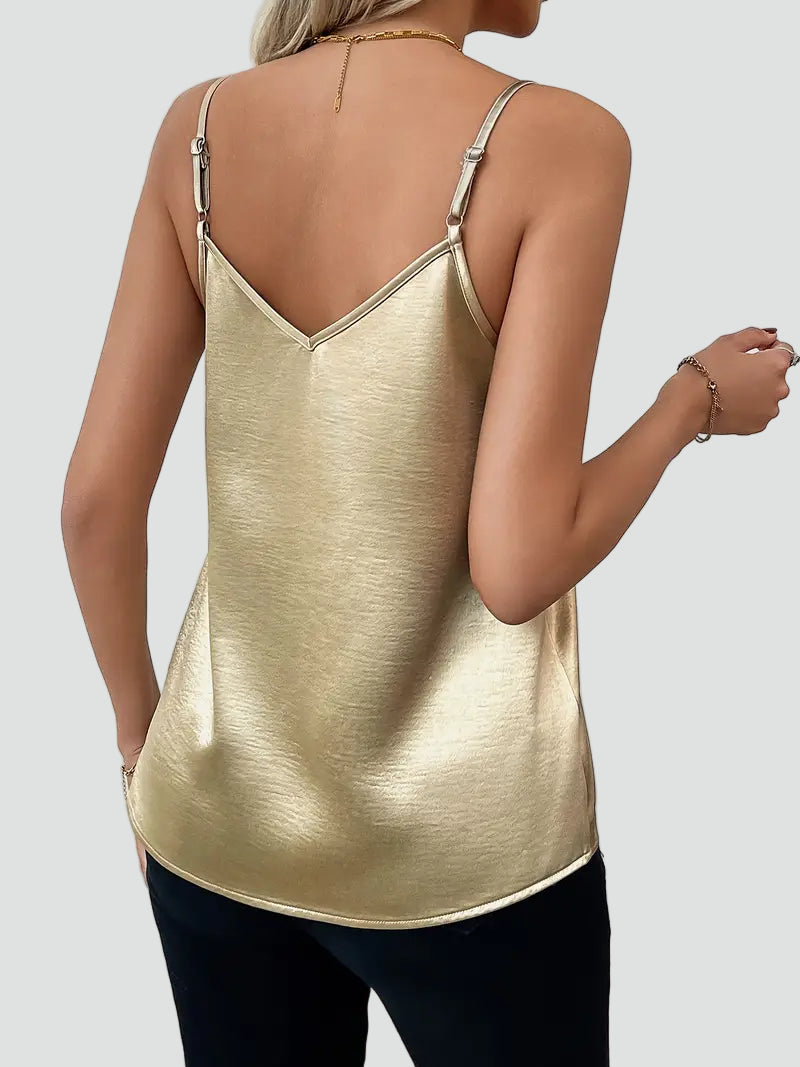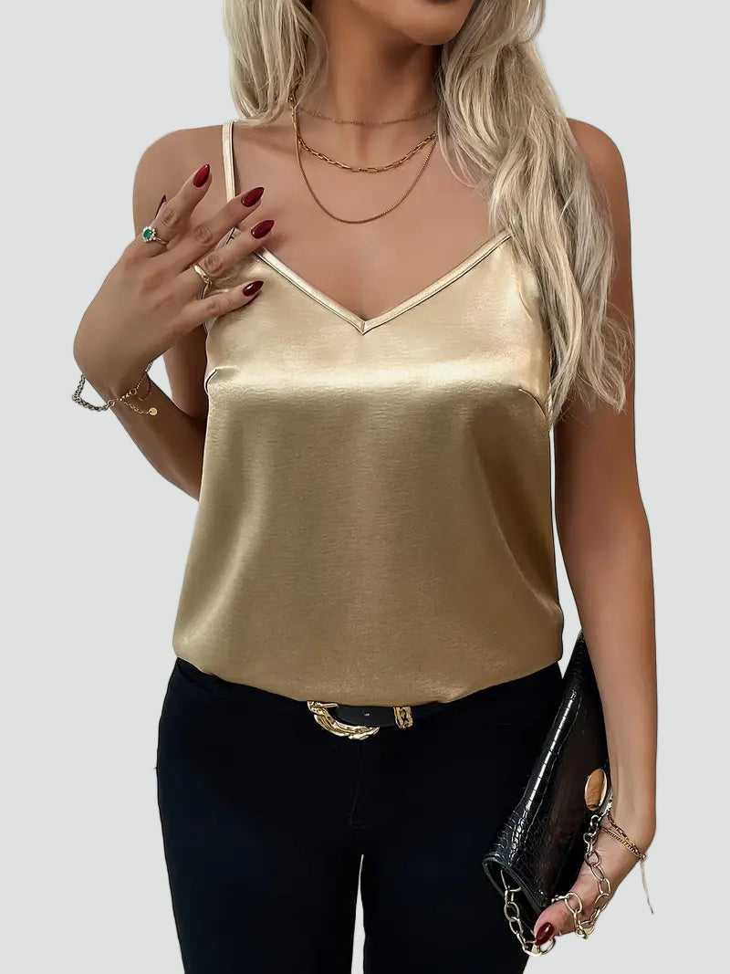 Ten satynowy top na ramiączkach to prosty sposób, żeby dodać stylizacji odrobiny elegancji. Gładka tkanina miękko układa się na sylwetce i delikatnie odbija światło, a dekolt w kształcie litery V podkreśla szyję i ramiona. Sprawdzi się pod marynarkę do pracy, do jeansów na wyjście albo w duecie ze spódnicą na wieczór.