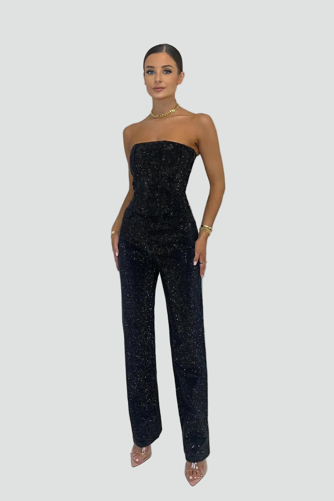 Glitterowy komplet damski bez ramiączek z topem i jeansami