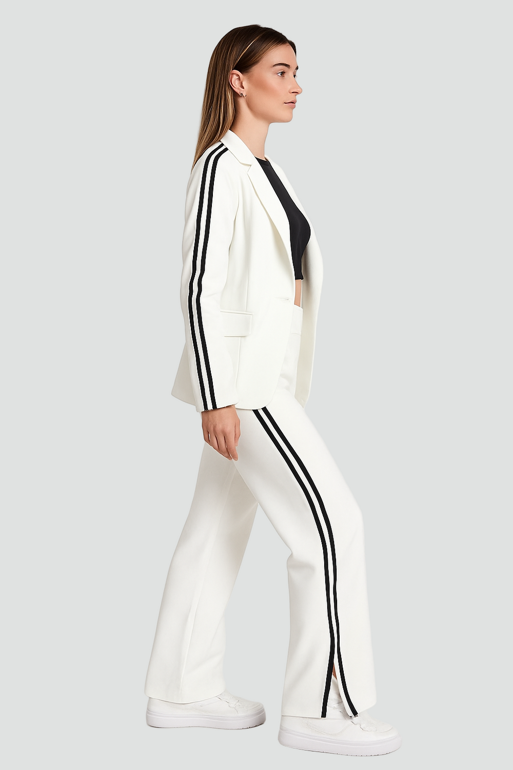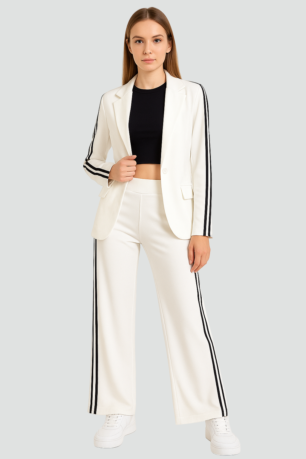 Komplet damski z marynarką i szerokimi spodniami z lampasami