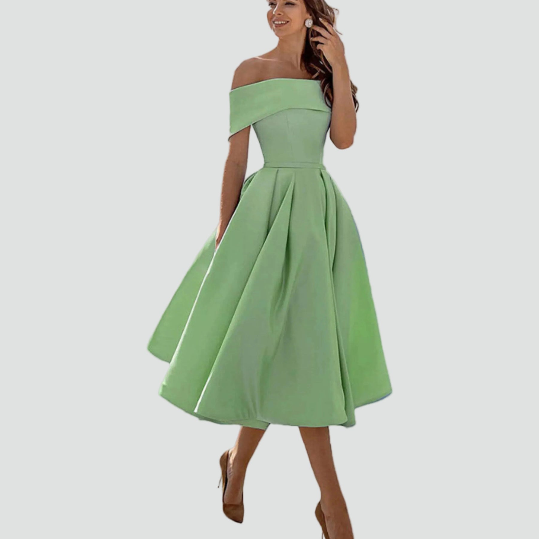 Cette robe cocktail midi évasée est le choix idéal pour les occasions spéciales, lorsque vous voulez paraître élégante, féminine et vraiment impressionnante. La coupe bardot, la taille marquée et le bas légèrement évasé font que le modèle tombe parfaitement sur la silhouette et attire les regards.