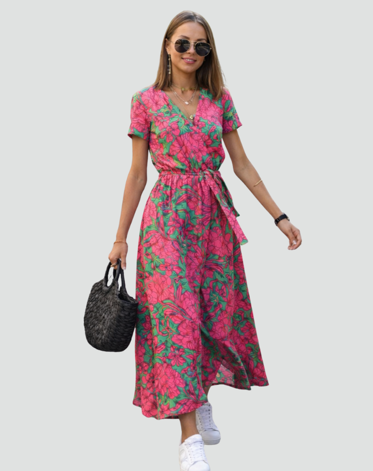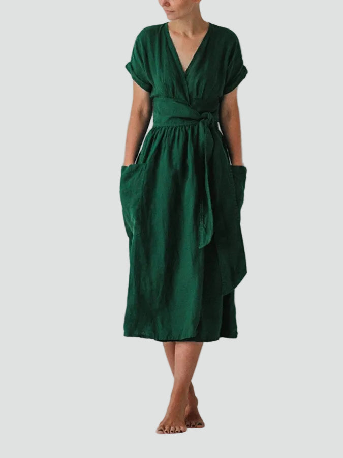 Dames midi wikkeljurk voor de zomer met ceintuur en V-hals