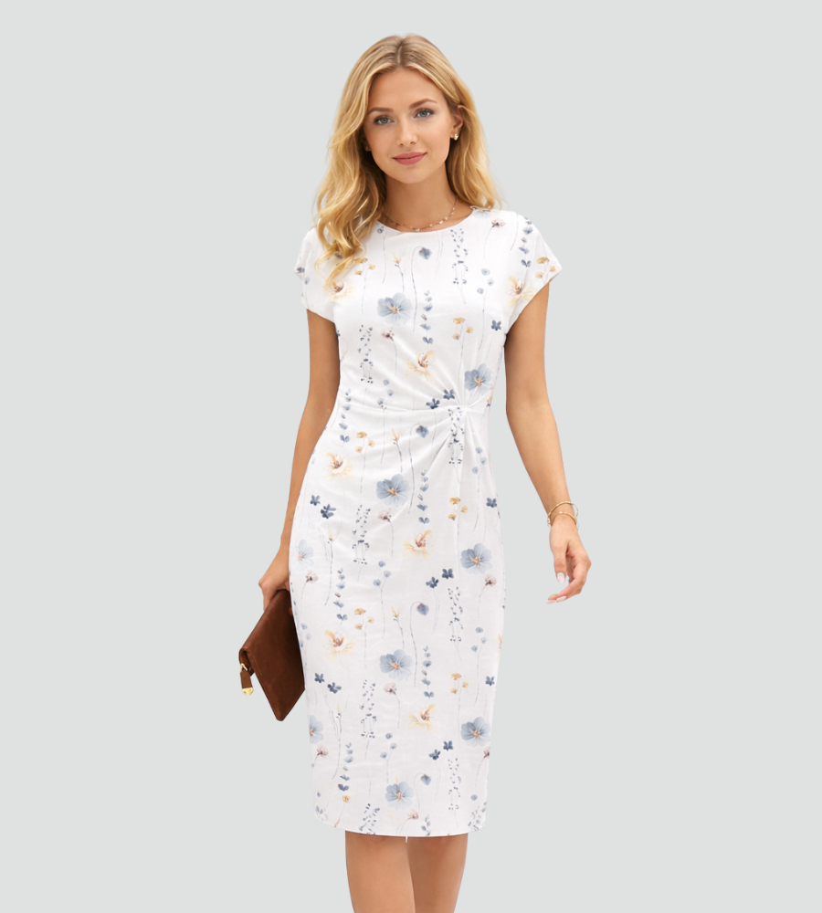 Dames midi-jurk voor het cocktailfeest met bloemen en plooien in de taille
