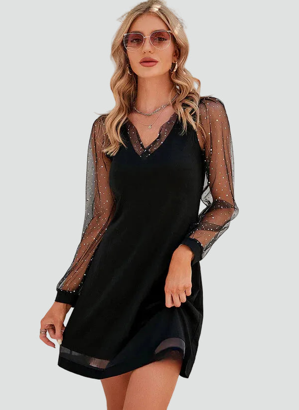 Feestelijke mini-jurk met V-hals en glinsterende mouwen