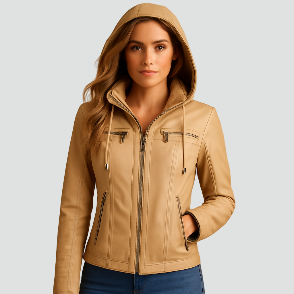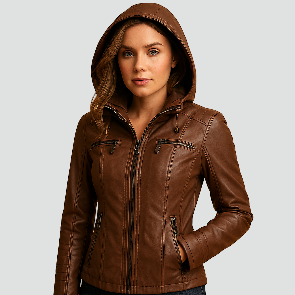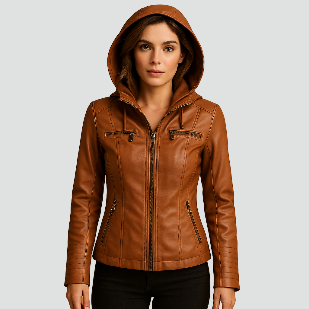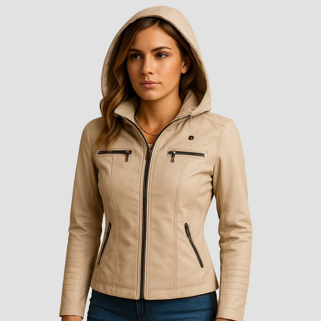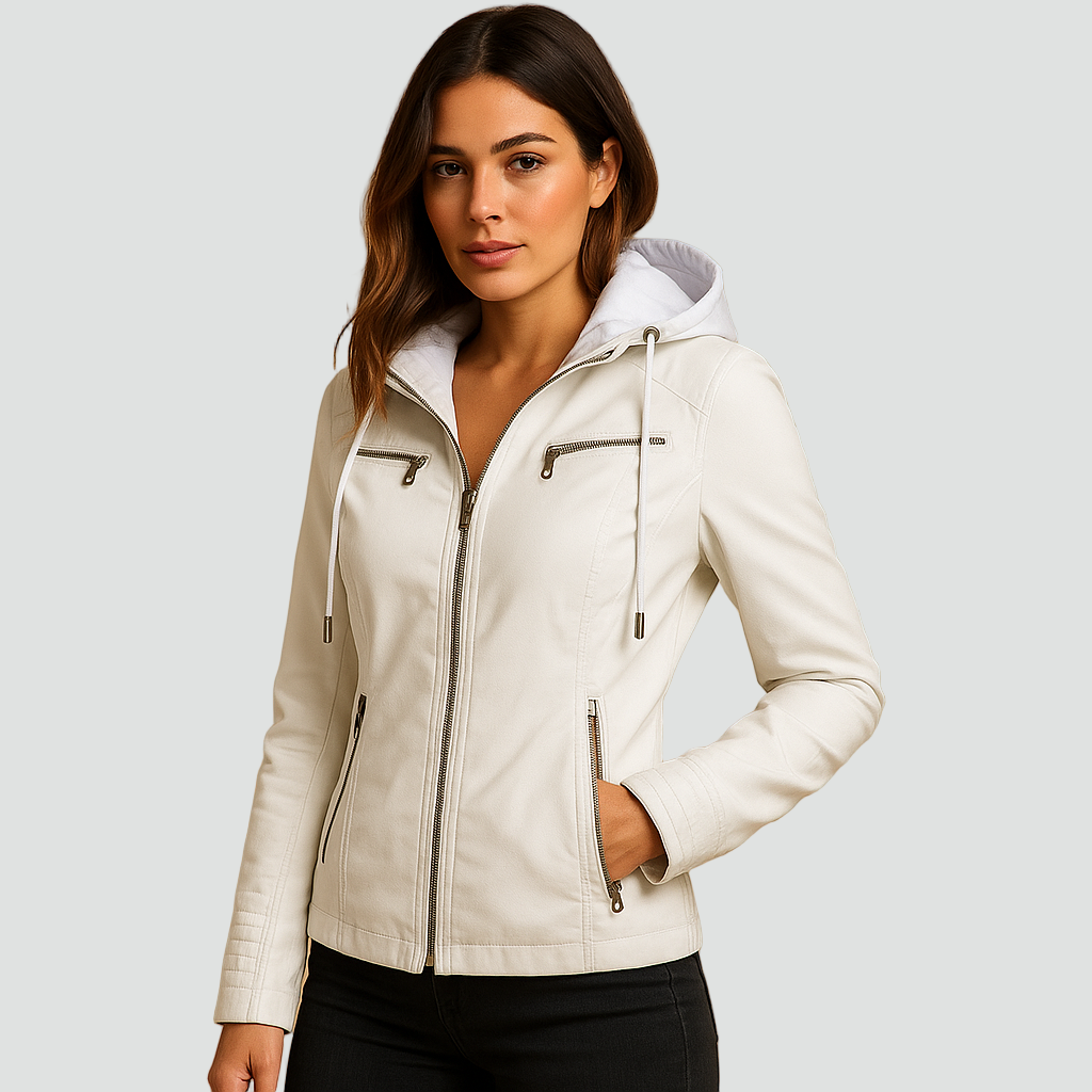 Damska kurtka biker ze skóry ekologicznej z kapturem i kieszeniami na zamek