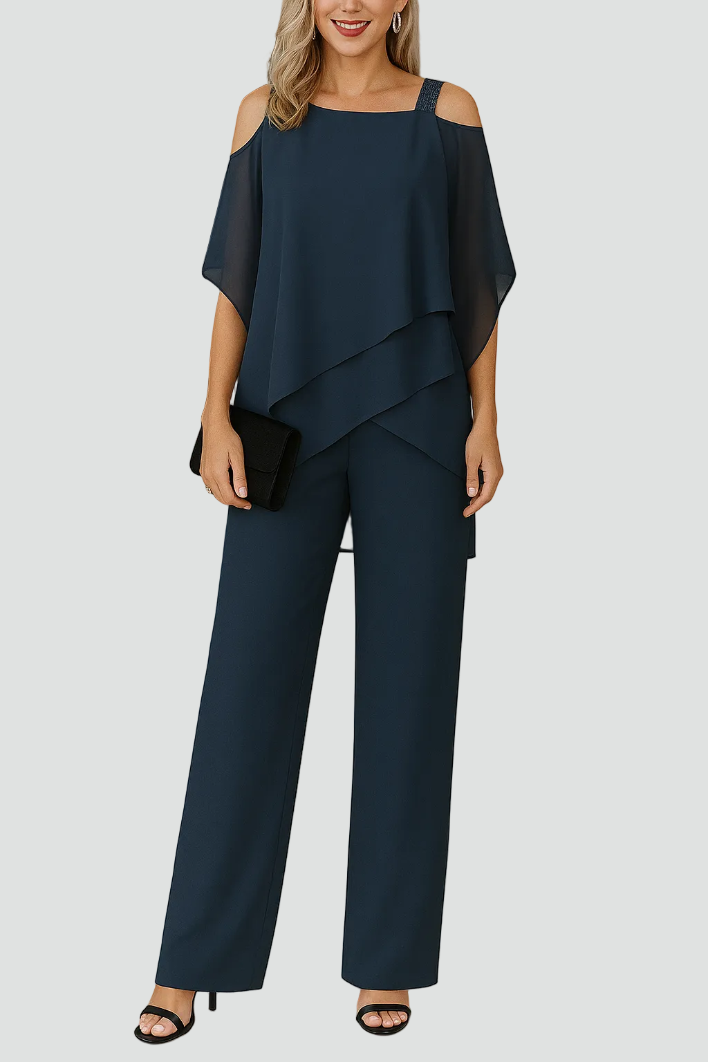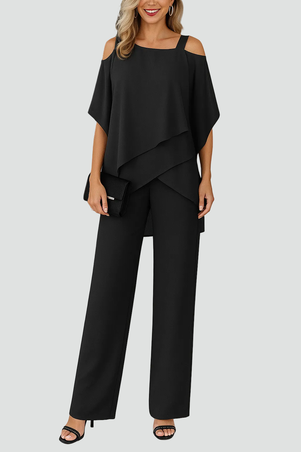 Ten stylowy damski komplet składa się z lekkiego topu z odkrytymi ramionami i eleganckich spodni z szerokimi nogawkami. Warstwowa góra miękko układa się na sylwetce i subtelnie maskuje miejsca, na których nie chcesz skupiać uwagi, a prosto puszczone nogawki optycznie wydłużają figurę. To nowoczesny zestaw, który sprawdzi się zarówno na imprezie, jak i na eleganckiej kolacji czy bardziej formalnej uroczystości.