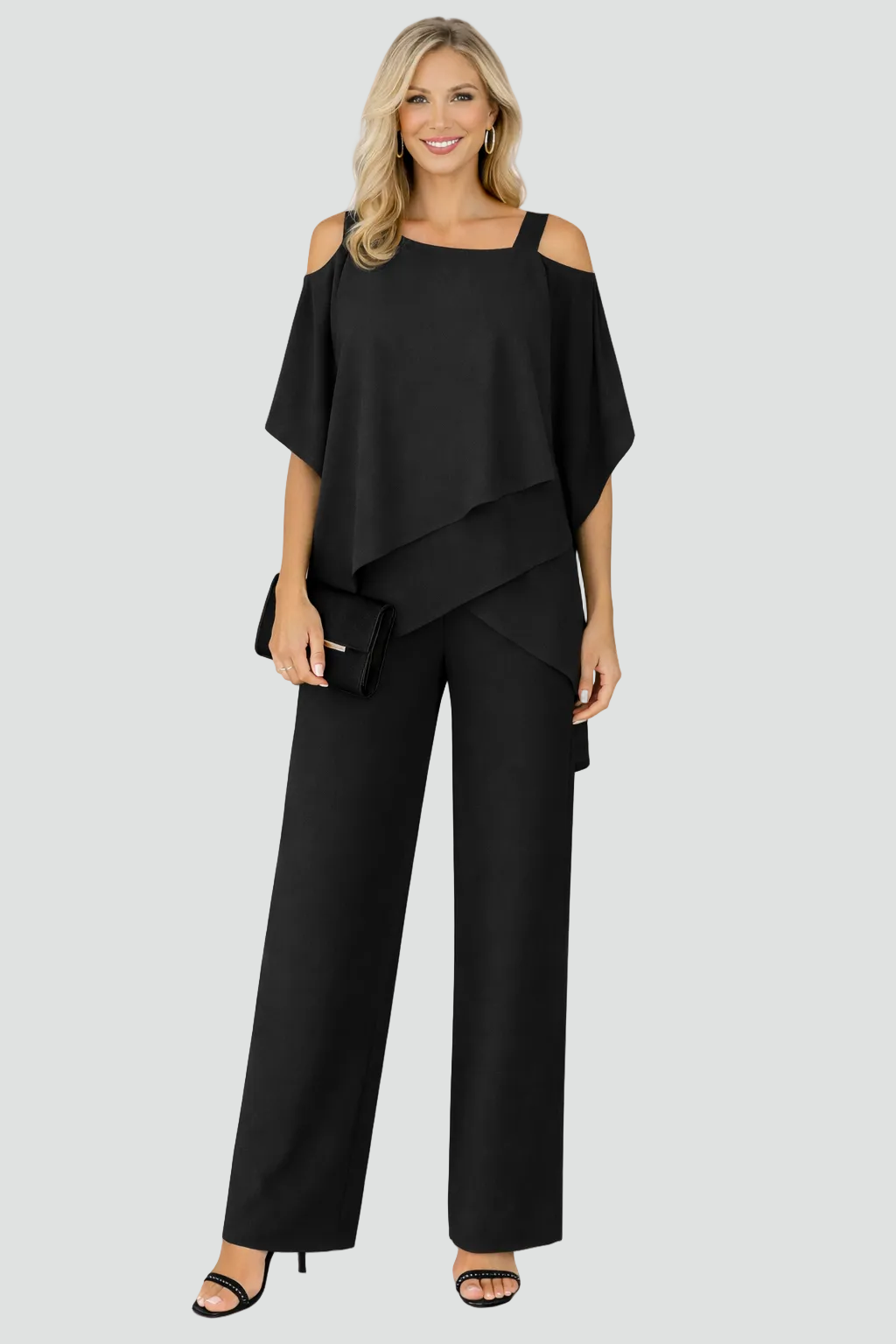 Damski stylowy dwuczęściowy zestaw z odkrytymi ramionami i szerokimi spodniami to idealna opcja, kiedy chcesz wyglądać elegancko i nowocześnie, ale bez przesadnego strojenia się. Góra z odkrytymi ramionami robi efekt lekkości i kobiecości, a szerokie spodnie dodają klasy i pięknie wydłużają sylwetkę, więc sprawdzi się na przyjęcia, wyjścia i ważniejsze okazje.